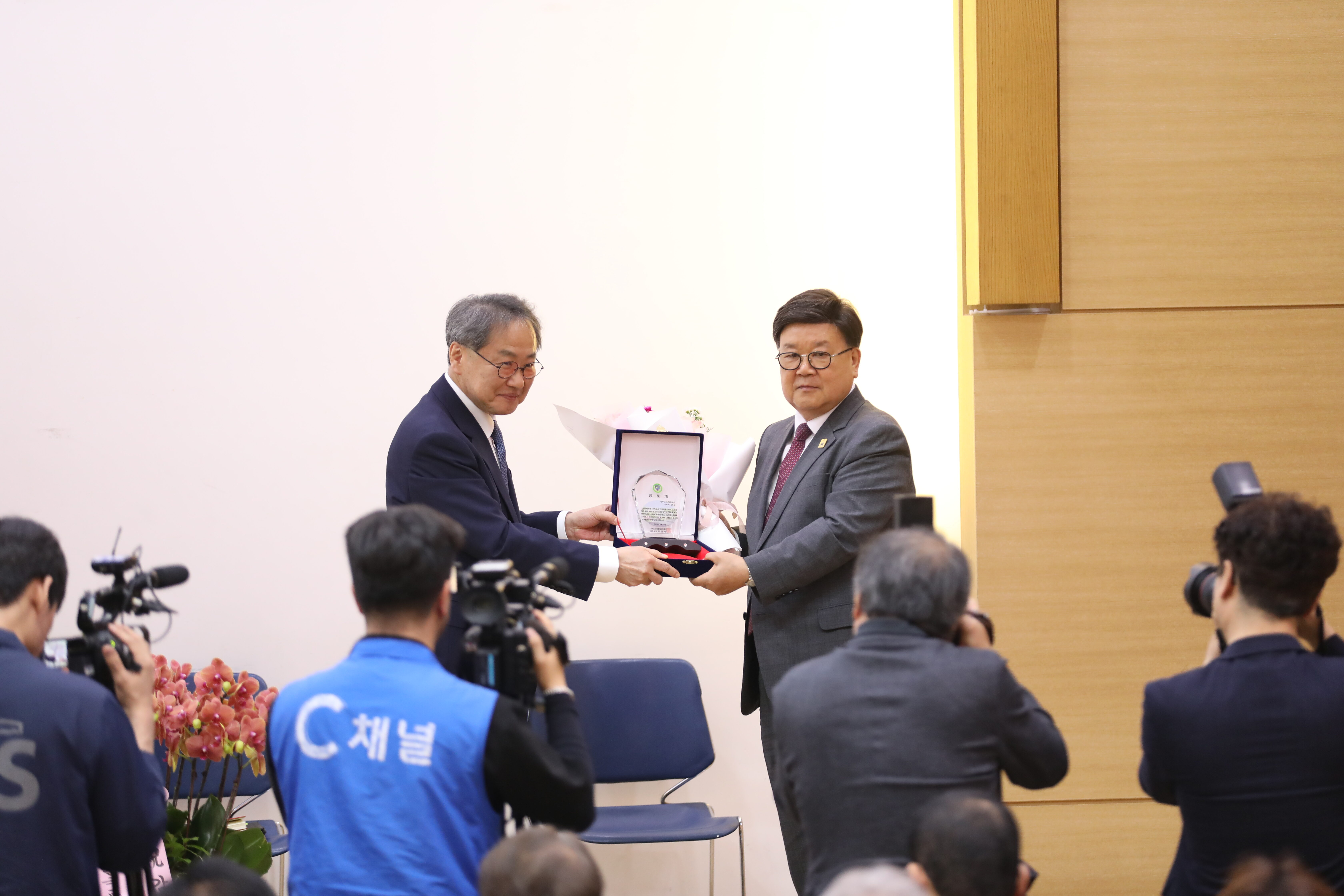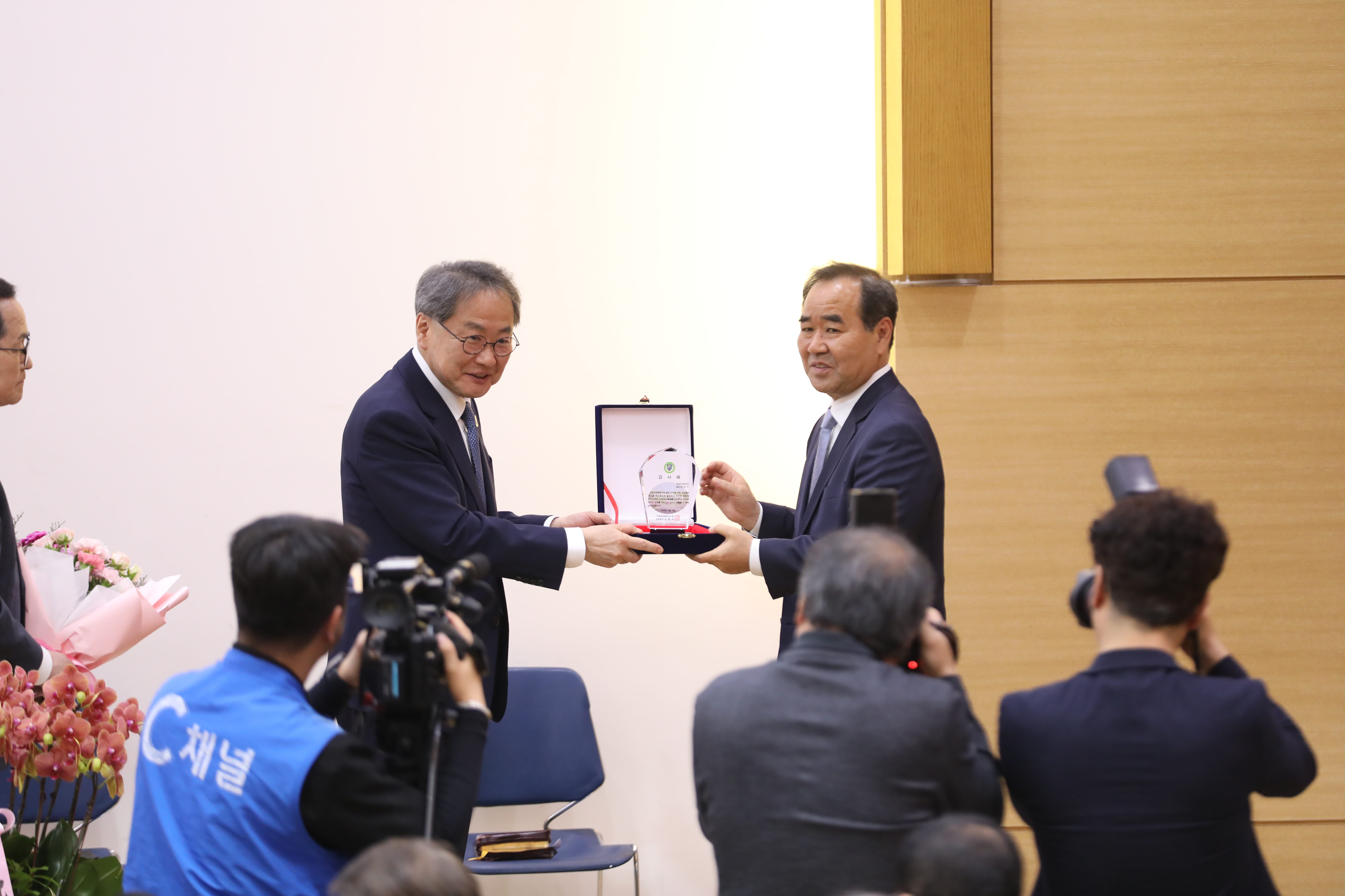 설교를 마친 김정석 감독회장은 지난 해 12월부터 본격적으로 추진된 이전사업을 맡아 수고하고 헌신한 지원본부장 이안수 장로와 리모델링 사업을 맡아 일정대로 진행한 우성인테리어 김석기 대표에게 각각 공로패와 감사패를 전달했다.