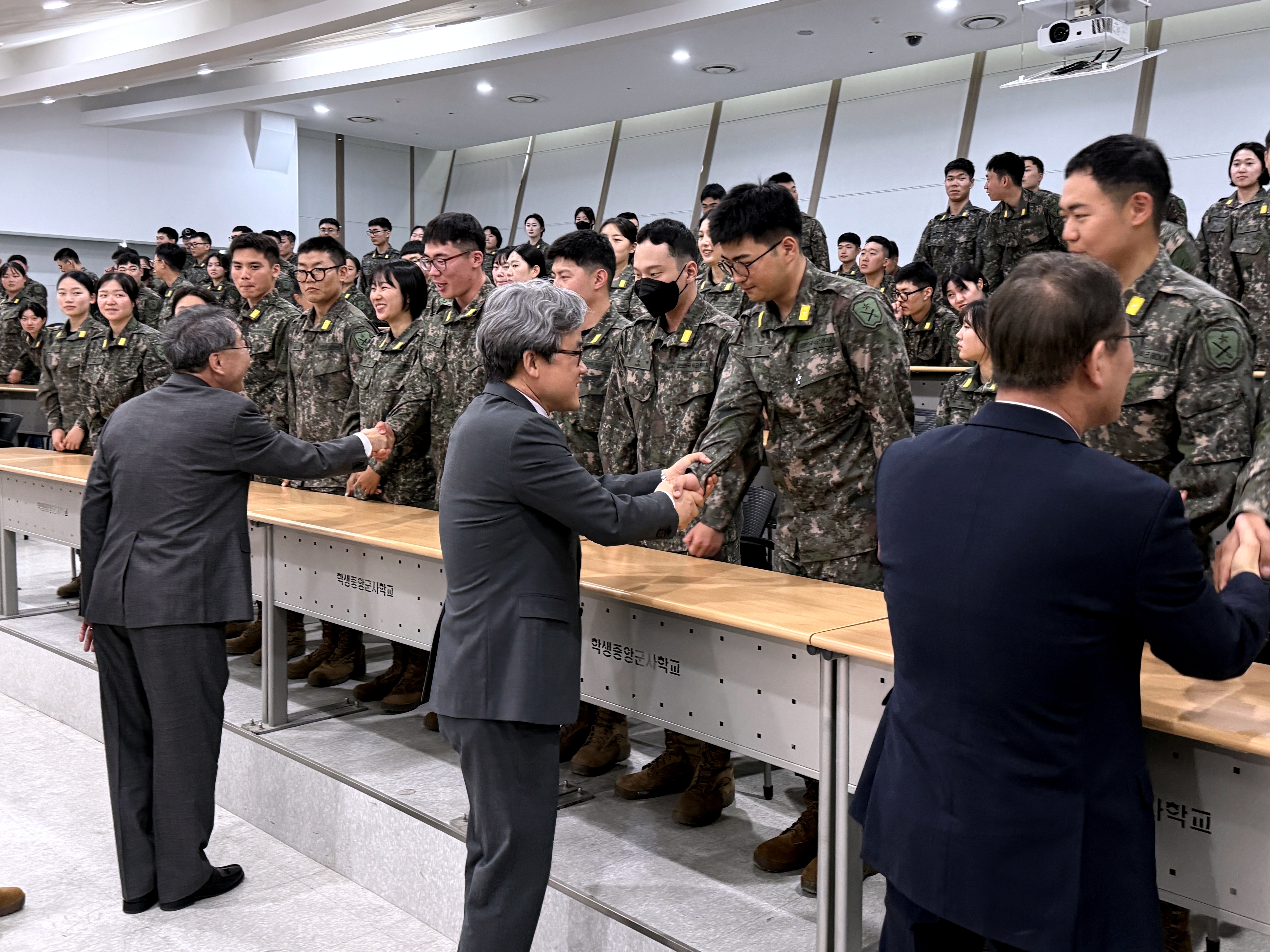 교장의 추가설명까지 경청한 김정석 감독회장은 신실한 기독교인 교장과 간부들, 그리고 군종실장이 마음을 합해 기도하면서 후보생들을 훈련시키는 점에 감사를 표하면서 기독교신앙에 바탕한 장교들과 간부들이 많이 배출돼 군복음화에 든든한 버팀목으로 더욱 굳게 자리해달라고 부탁했다. 이어 김동호 교장이 대표로 김정석 감독회장에게 야전잠바를 선물한 후 2층 로비로 이동해 환영의 시간을 가졌다.