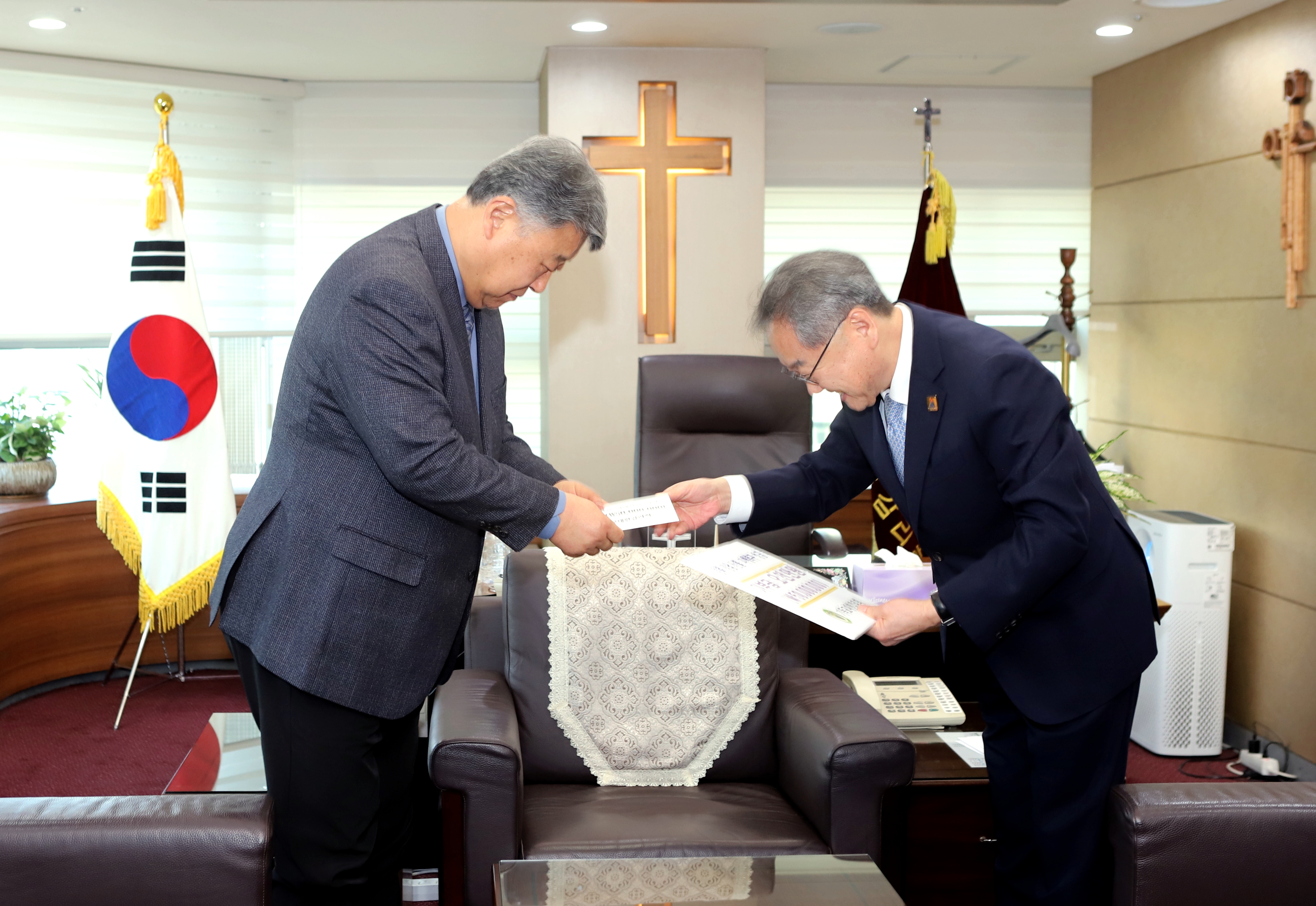 4월 28일(월) 오후 5시 기감 감독회장실에서 예장통합 김영걸 총회장과 예장합동 김종혁 총회장을 반갑게 맞이한 김정석 감독회장은 3월에 일어난 대형산불로 인해 큰 피해를 입은 교회 상황에 안타까움을 전하고 28일 대구에서 발화한 산불 소식을 언급하며 교회의 피해가 또 다시 일어나지 않기를 간절히 바란다고 말했다. 계속해서 지난 2023년 4월에 일어난 강릉산불로 인해 감리교회가 큰 피해를 입었을 당시 합동측과 통합측에서 복구성금을 지원해 큰 힘이 되었다며 이번에 “비록 5천만 원이지만 보은(報恩)의 마음으로 성금을 준비했다.”라고 취지를 전했다.