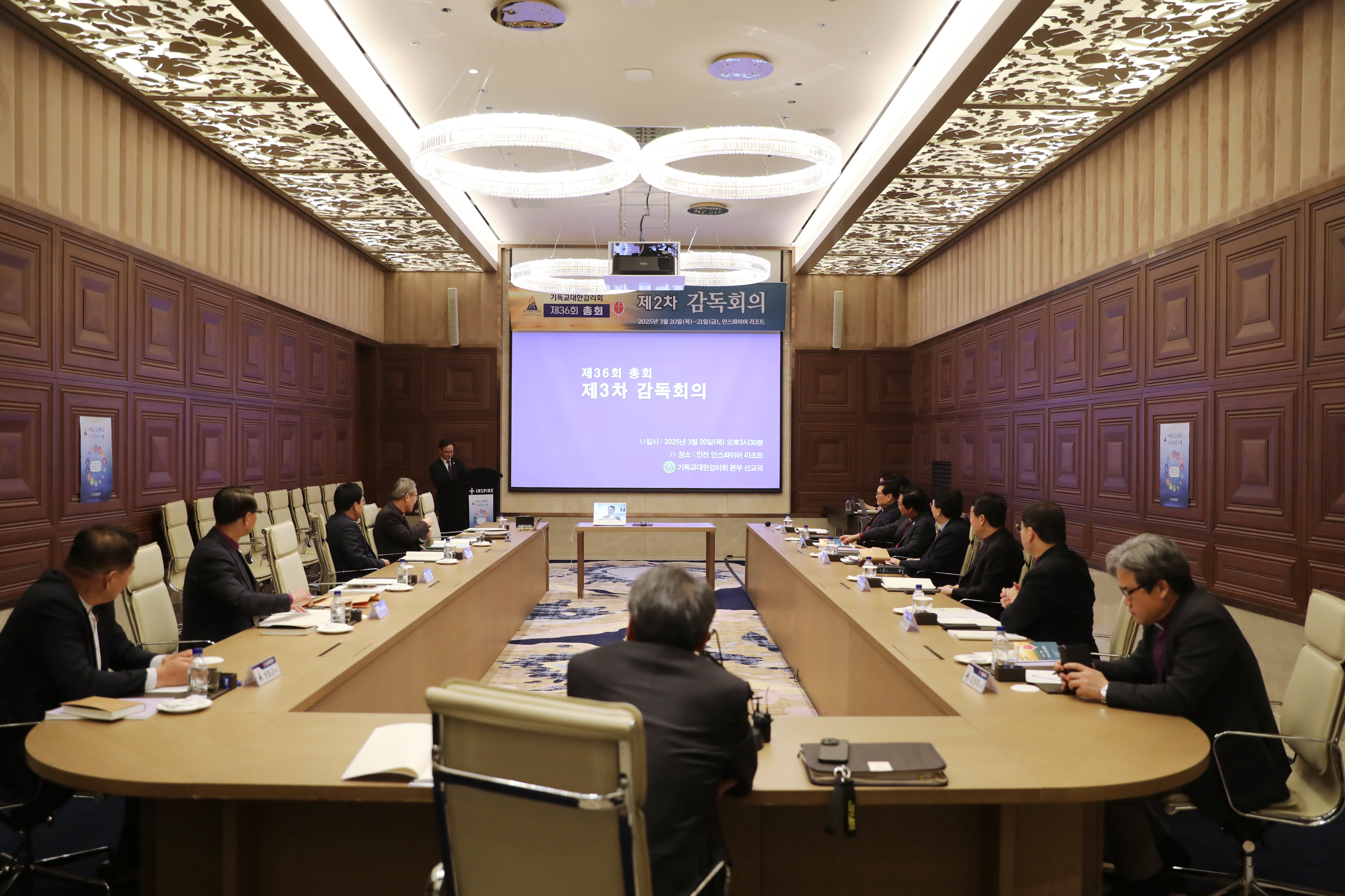 제36회 총회 제3차 감독회의가 3월 20일(목) 오후 인천 영종도의 인스파이어 리조트에서 서울남연회(유병용 감독) 주관으로 개최됐다. 미주자치연회 권덕이 감독은 화상으로 함께했으며 이날 다뤄진 의제는 ❶개신교 한국선교 140주년기념사업의 건 ❷기도운동본부, 전도운동본부 설치의 건 ❸KMC-GMC 관계 설정의 건 ❹5월 전국 임원 정책세미나의 건 ❺기관파송 인선위원회 보고의 건 ❻연회 간담회 잔여 일정의 건 등이었다.