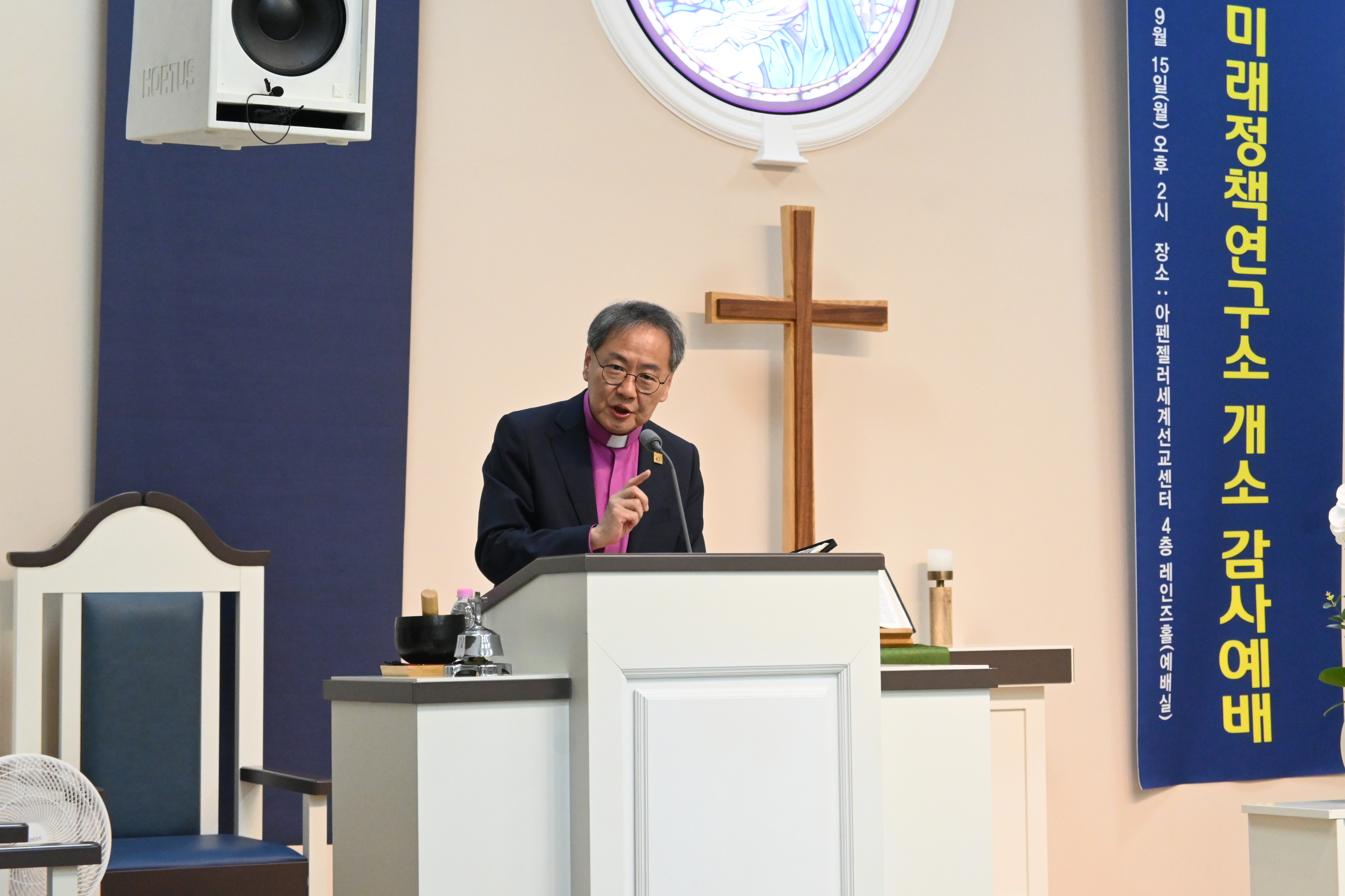 기독교대한감리회(김정석 감독회장)는 미래교회의 방향 예측과 함께 맞춤정책을 만들어내기 위한 목적으로 장단기발전위원회(김성복 감독/ 서울연회) 산하에 ‘감리회미래정책연구소’(소장 이성우/ 이하 감미연)를 설립하고 9월 15일(월) 오후 2시 북아현동에 위치한 아펜젤러세계선교센터 4층 예배실에서 ‘개소 감사예배’를 드렸다. 감미연은 아펜젤러세계선교센터(서울시 서대문구 서대문구 북아현로 20길 69) 2층에 사무실을 마련했다.
