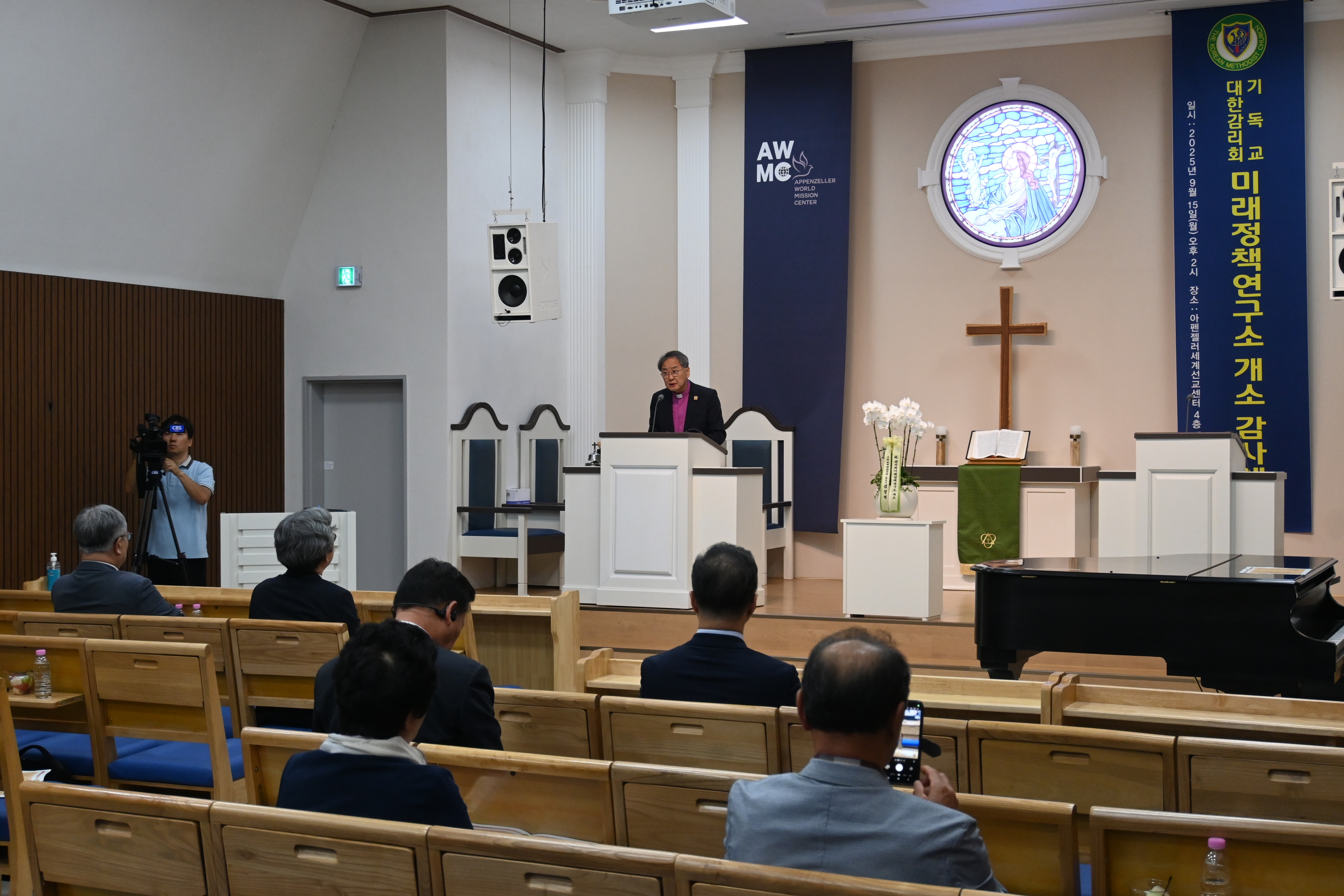 장단기발전위원회 주관으로 드려진 개소감사예배에서 김정석 감독회장은 <미가 6:8>을 본문으로 하여 메시지를 선포했다. 감미연이 시대를 향한 하나님의 선하신 뜻을 찾아 감리교회에 이식하는 역할을 해달라고 주문하면서 우선적으로 우리가 살아가고 있는 이 시대, 종교가 어떤 역할을 해야 하는지에 관해 연구하여 정책으로 담아내도록 부탁했다. 이어 사회에서 억눌린 약자의 소리를 비롯해 교회를 향한 기대치, 그리고 하나님나라를 향한 기대감을 담아낼 수 있어야 할 것이라고 부연했다. 계속해서 겸손한 자세로 하나님이 원하시는 뜻을 정책으로 담아내는 기관으로 자리매김해달라며 감리회의 새로운 변화를 향한 모멘텀 역할을 기대한다고 축복했다.