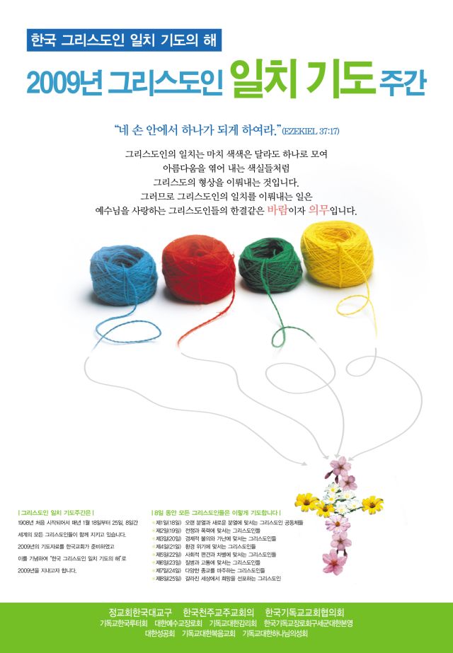 1. 세계교회협의회와 교황청은 매년 그리스도인 일치기도주간 자료집을 작성하고 있습니다. 이 자료집은 각국의 교회나 그리스도인 공동체에 의해서 초안하고 최종 문건은 양자가 합의하여 채택하게 됩니다. 2009년 그리스도인 일치기도회는 한국의 한국기독교교회협의회와 한국 천주교 주교회의가 함께 초안하였으며 2007년 9월에 최종 문건이 채택되었습니다.