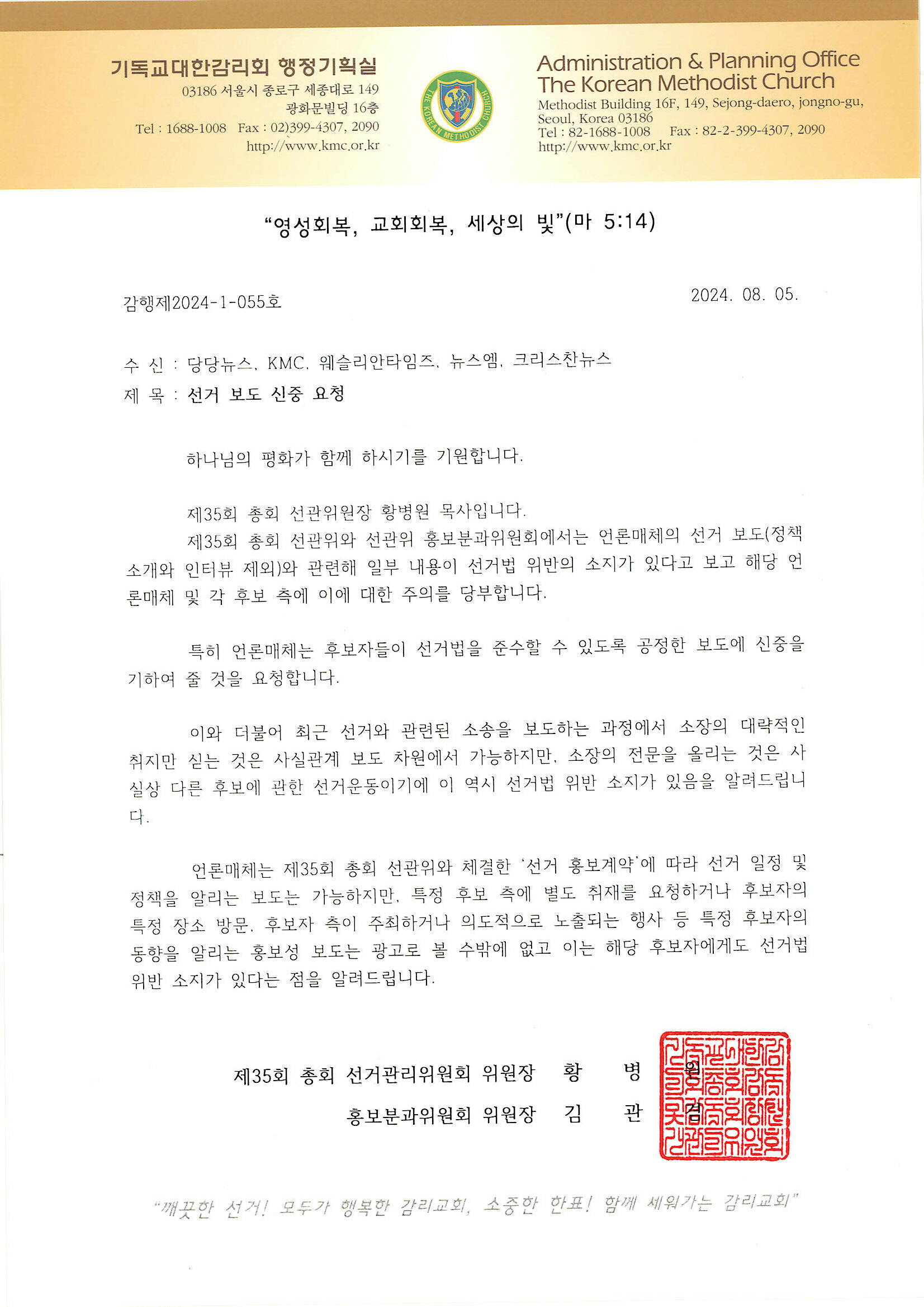 언론매체는 제35회 총회 선관위와 체결한 ‘선거 홍보계약’에 따라 선거 일정 및 정책을 알리는 보도는 가능하지만, 특정 후보 측에 별도 취재를 요청하거나 후보자의 특정 장소 방문, 후보자 측이 주최하거나 의도적으로 노출되는 행사 등 특정 후보자의 동향을 알리는 홍보성 보도는 광고로 볼 수밖에 없고 이는 해당 후보자에게도 선거법 위반 소지가 있다는 점을 알려드립니다.