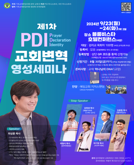 기독교대한감리회 본부 교육국(총무:김두범 목사)은 PDI 미니스트리와 함께 목회자의 영적 부흥과 교회변혁을 위한 ‘교회변혁 영성 세미나’를 준비하였습니다. 목회와 교회에 새로운 부흥의 불씨가 될 이번 세미나에 목회자들의 적극적인 참여를 바랍니다.