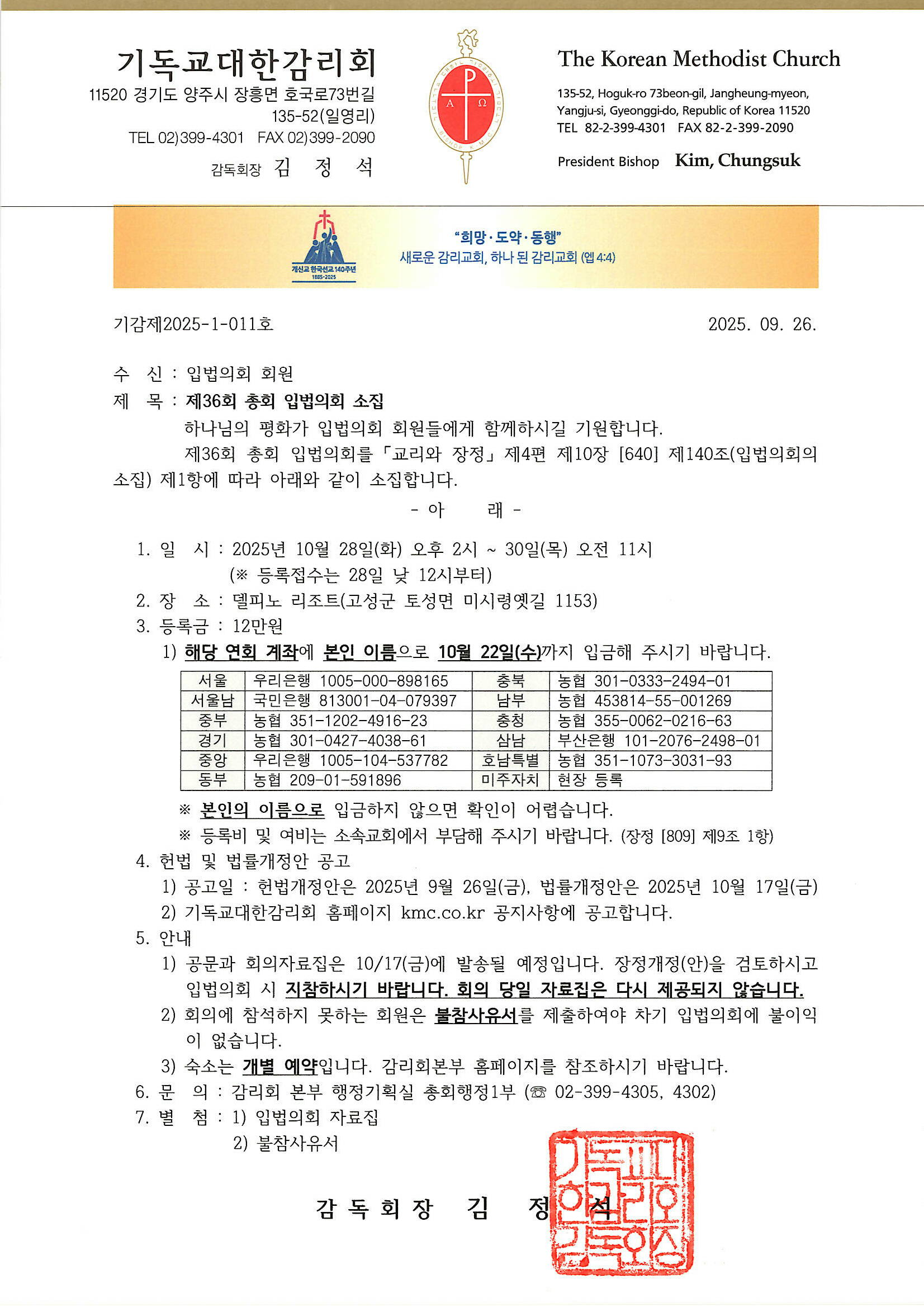 제36회 총회 입법의회 소집 공고 하나님의 평화가 입법의회 회원들에게 함께하시길 기원합니다. 제36회 총회 입법의회를 「교리와 장정」 제4편 제10장 [640] 제140조(입법의회의 소집) 제1항에 따라 아래와 같이 소집합니다. - 아 래 - 1. 일 시 : 2025년 10월 28일(화) 오후 2시 ~ 30일(목) 오전 11시 (※ 등록접수는 28일 낮 12시부터) 2. 장 소 : 델피노 리조트(고성군 토성면 미시령옛길 1153) 3. 등록금 : 12만원 1) 해당 연회 계좌에 본인 이름으로 10월 22일(수)까지 입금해 주시기 바랍니다.