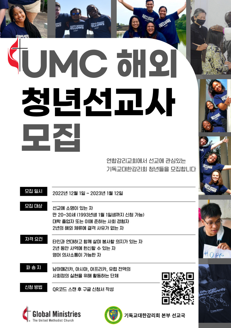 연합감리교회에서 기독교대한감리회 청년들을 대상으로 해외 청년선교사(Global Mission Fellows)를 모집합니다. 선교에 관심 있으신 청년분들의 많은 참여 부탁드립니다.