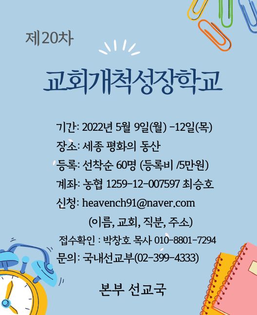 3. 등록 : 선착순 60명이며, 목회자 부부의 참석을 적극 권합니다.