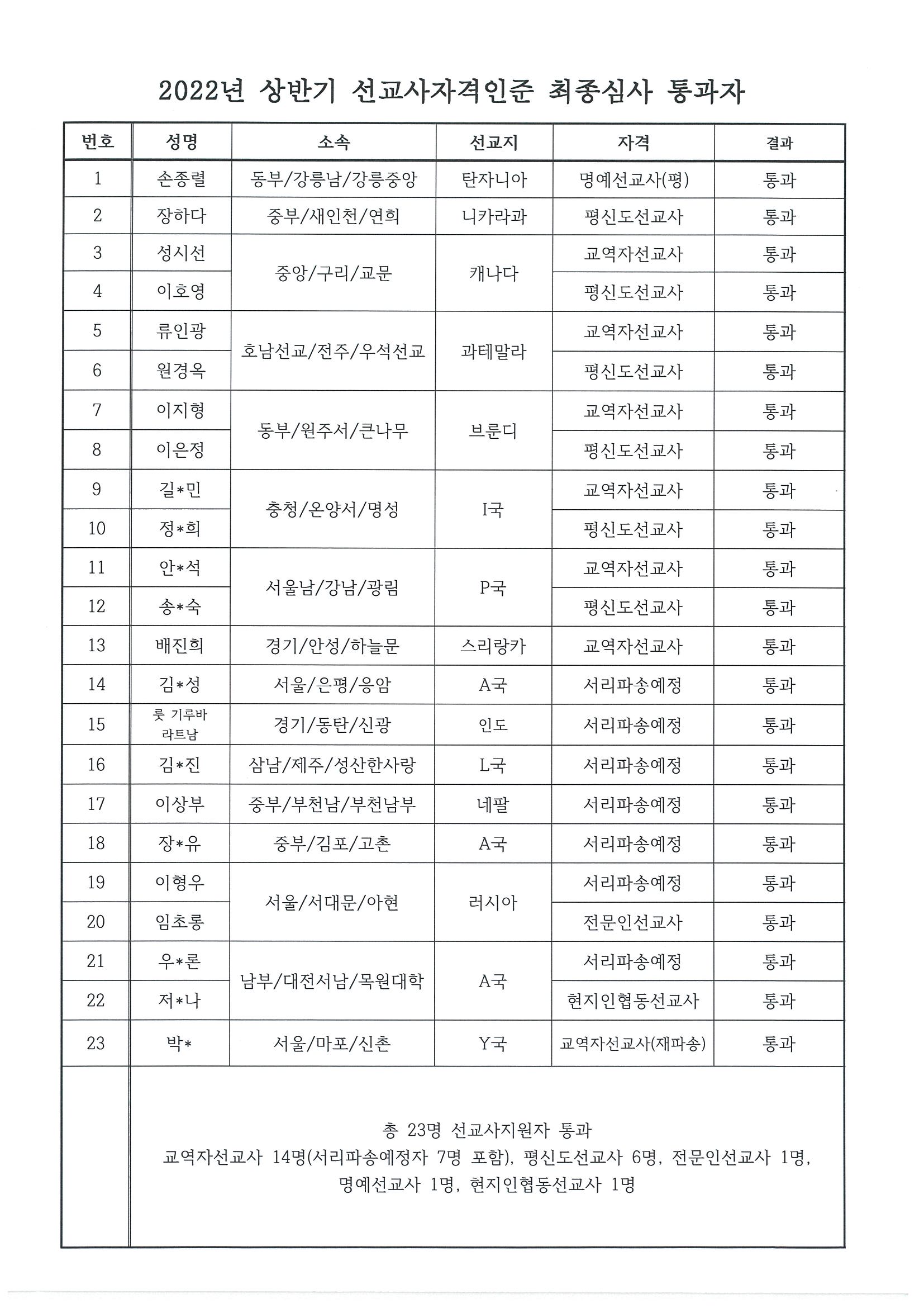 2022년도 상반기 선교사자격인준심사 최종결과 1부