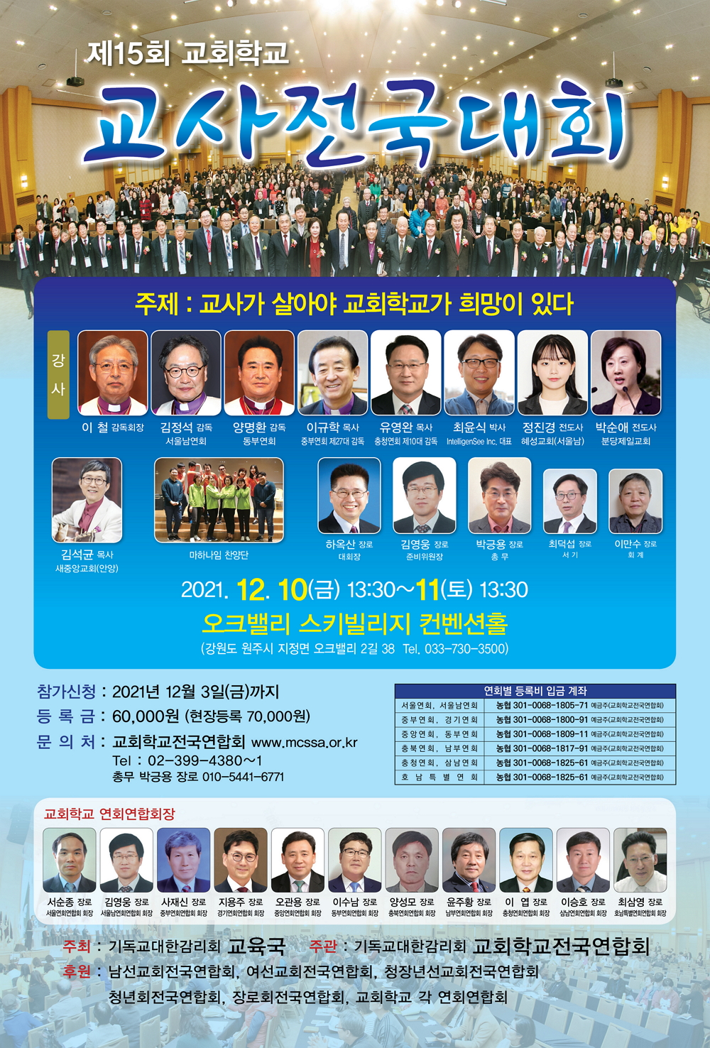 어린 영혼들을 살리기 위해 열정을 다해 경주해 온 교회학교전국연합회는 교사들의 영성을 새롭게 하여 교회학교를 살리고 감리교회의 부흥을 일으키는 계기를 만들고자, 영적 부흥의 새물결을 일으키고 계신 목사님들을 강사로 모시고 15회 교사전국대회를 원주 오크밸리에서 개최하고자 합니다. 개 교회 교사(유치부, 초등부, 중.고등부, 청년부)와 교육 담당 목회자님들은 필히 참석하여 주시기 바라며, 교육관련자 및 다음세대를 세우는 일에 관심있으신 분 누구나 참석이 가능합니다. 또한 교사들간의 소통과 화합의 시간이 되는 금번 교사전국대회를 통해 부르심의 소명을 다시 한번 각인하고 영혼을 귀히 여기시는 주님의 영성과 열정으로 가득 채움 받아 교회로 돌아가서 교회학교를 크게 부흥, 발전시키는 축복의 기회가 되기를 소망합니다.