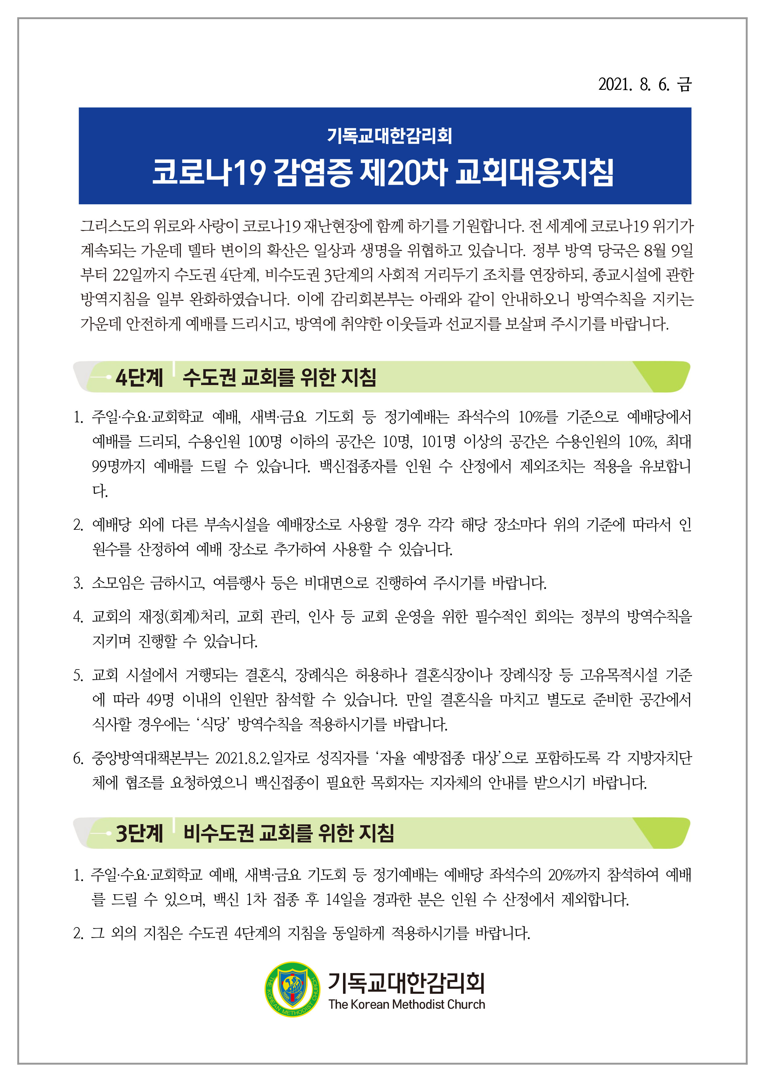 [공지] 코로나19 4단계 변경된 종교시설 예배 및 방역지침(8.9~8.22)