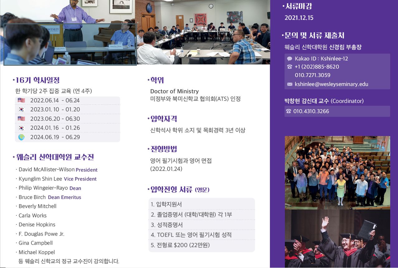 감리회본부 교육국은 미국 웨슬리신학대학원(워싱톤 D.C. 소재)과 MOU를 맺고 감리회 목회자 최고지도자과정의 일환으로 목회학박사과정(Doctor of Ministry Global Asian Track)을 진행하기로 했습니다. 감리회 목회자들이 이 과정에 참여하여 뛰어난 영적 리더로 세워지기를 소망하며 아래와 같이 소개합니다. 자세한 내용은 첨부파일 참조 * 학교 소개 동영상 https://youtu.be/osSpHWhYvFw 지원서 (application) https://wesleyseminary.egnyte.com/fl/9zT7kNox6Y 감리회본부 교육국 첨부파일 6143f062793524455680.jpg WTSTrack16.Brochure.pdf WTSTrack16.Brochure.pdf