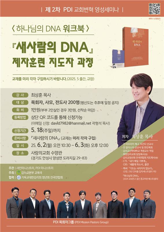 기독교대한감리회 본부 교육국(총무: 김두범 목사)과 PDI 미니스트리, 샤인 미니스트리와 함께 목회자의 영적 부흥과 교회변혁을 위한 ‘제 2차 교회변혁 영성 세미나’를 준비하였습니다. 1차 세미나의 큰 호응에 이어서, 2차 세미나를 통해 목회와 섬기는 교회에 놀라운 회복과 새로운 부흥의 불씨가 될 것입니다.