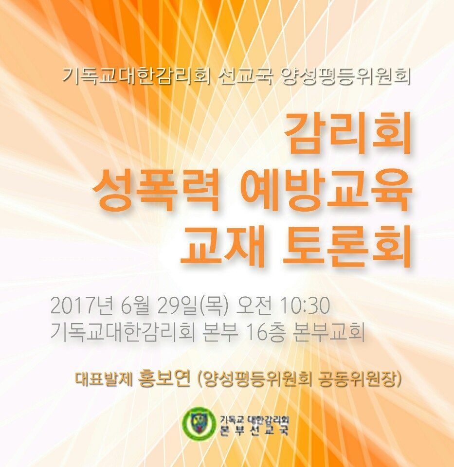 - 선교국 양성평등위원회는 올해 감리회 입법의회에서 양성평등교육, 성폭력예방교육을 의무화하는 방안(준회원 교육과 정회원 연수교육, 신천장로교육 등)을 고민하고 있다. 이번 토론회는 그중 성폭력예방교육 교재를 만들기 위한 사전 토론회로 준비하고자 한다.