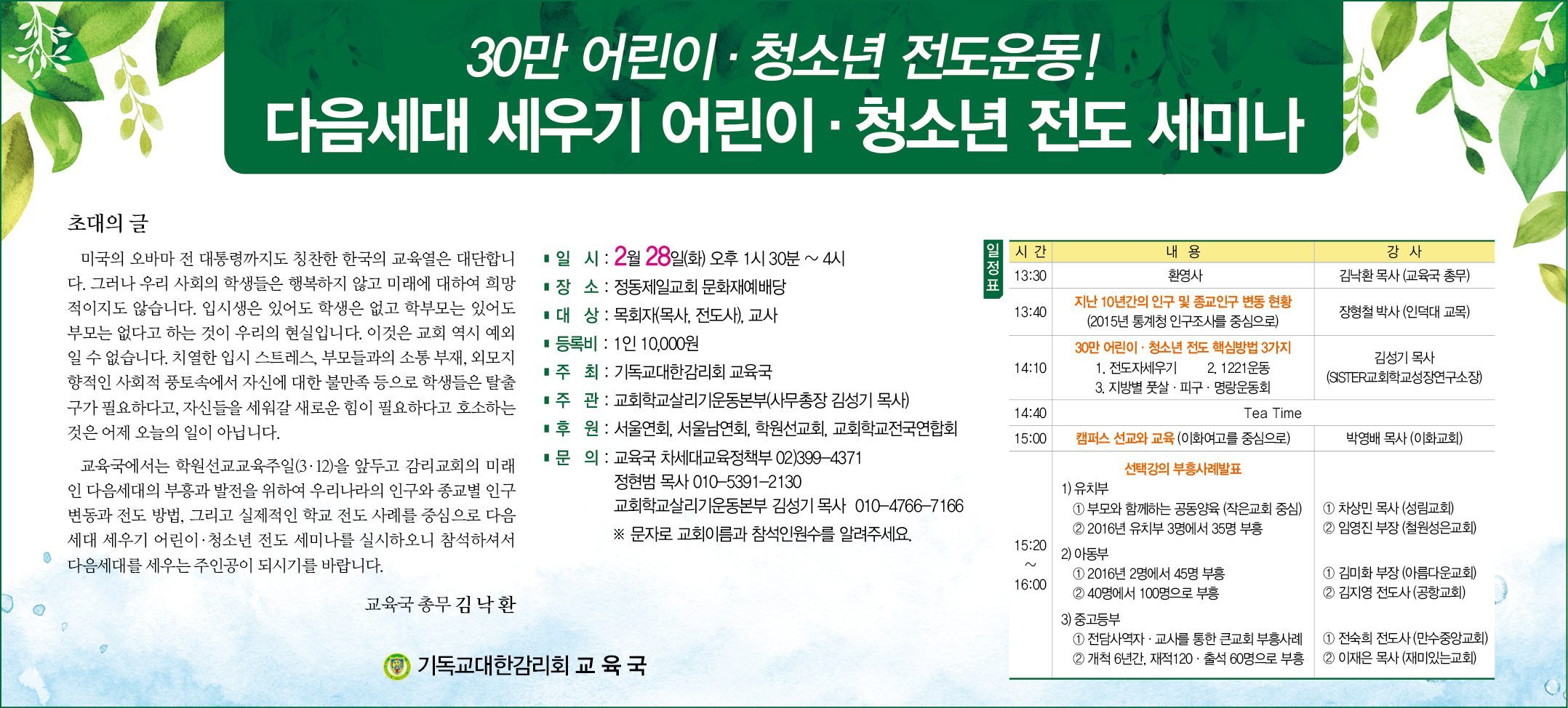 교육국에서는 학원선교교육주일(3.12)을 앞두고 감리교회의 미래인 다음세대의 부흥과 발전을 위하여 우리나라의 인구와 종교별 인구변동과 전도 방법, 그리고 실제적인 학교 전도 사례를 중심으로 다음세대 세우기 어린이·청소년 전도 세미나를 실시하오니 참석하셔서 다음세대를 세우는 주인공이 되시기를 바랍니다.