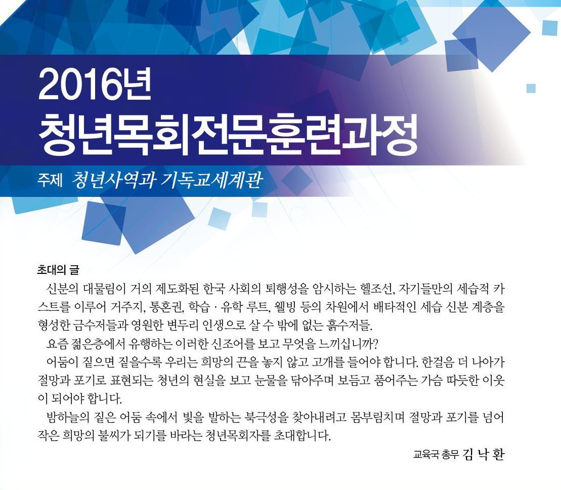 | 오후 | 12:00-14:00 점심식사 14:00–15:30 청년세대를 위한 기독교세계관 (김준영 디렉터) 15:30-17:00 청년현실에 공감하다 (은수미 박사) 17:00-18:00 조별 모임 18:00-19:30 저녁식사 19:30-21:00 청년예배 디자인 (심은수 목사) 21:00-22:00 조별 모임 | 12:00-13:00 점심식사 13:00–14:00 청년설교 준비 (김영석 목사) 14:00-15:00 소그룹과 양육 (김운용 목사) 15:00-15:30 공동 질의와 응답 15:30-16:00 수료식 |