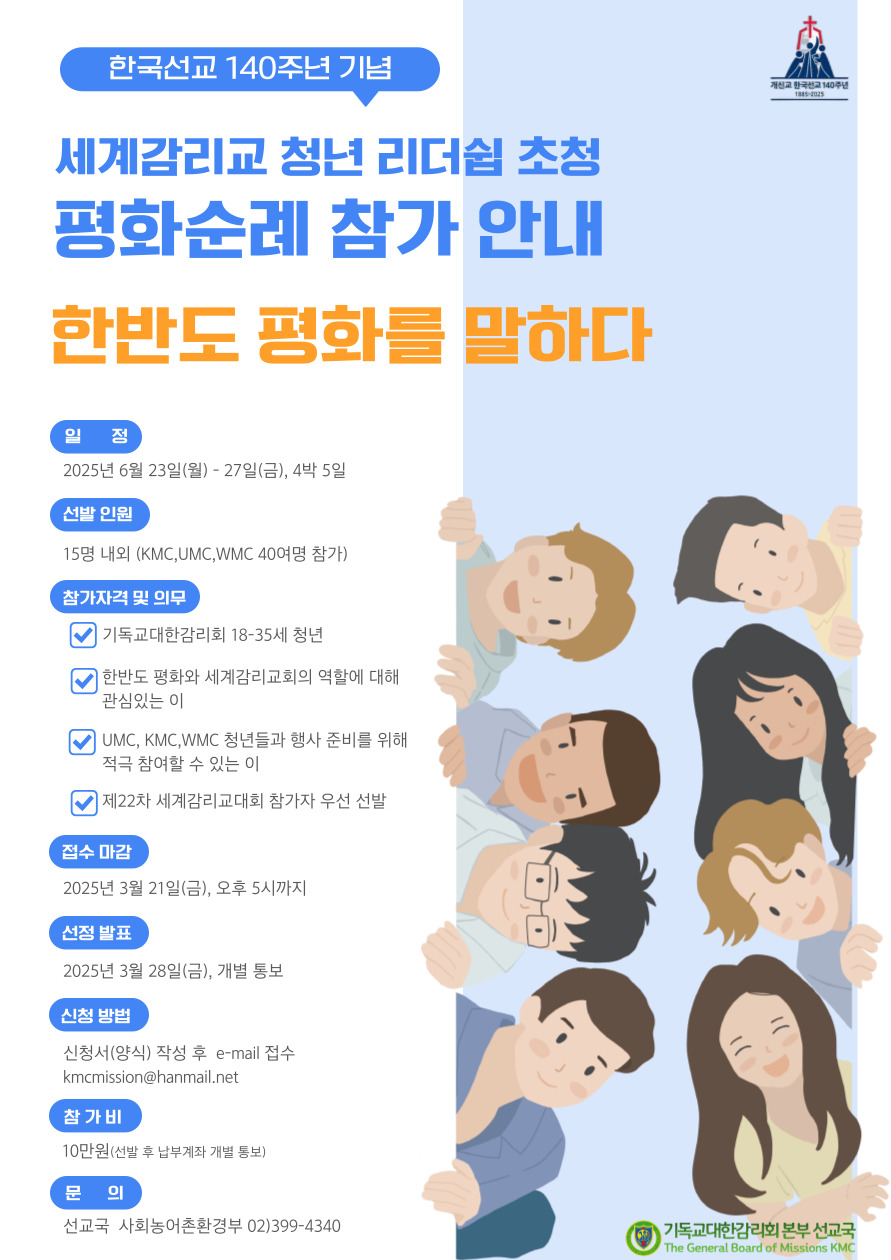 기독교대한감리회 본부 선교국은 한국 선교 140주년을 맞아, 세계감리교 청년들과 함께 한반도 평화세우기(Peace-Building)를 위한 청년 지도력 발굴 및 평화 감수성 함양을 목표로 평화순례 프로그램을 진행합니다.