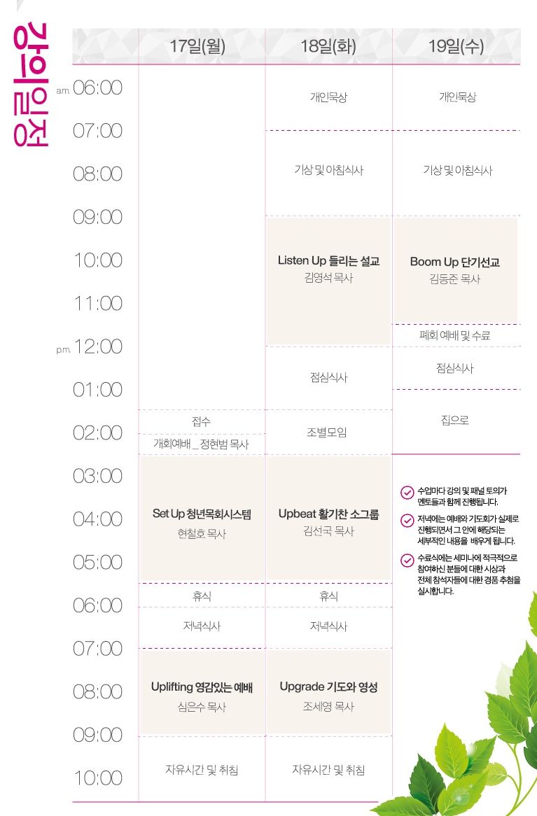 청년 목회 멘토들의 구체적이고 실제적인 강의와 패널 토의로 알차게 구성된 2박 3일간의 일정은 여러분에게 작지 않은 도움이 될 것입니다.