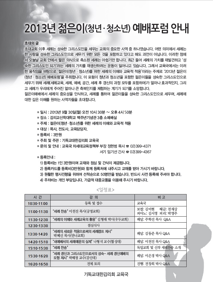 자세한 내용은 2013 젊은이(청년.청소년)예배포럼 안내 첨부파일 받기2 참조