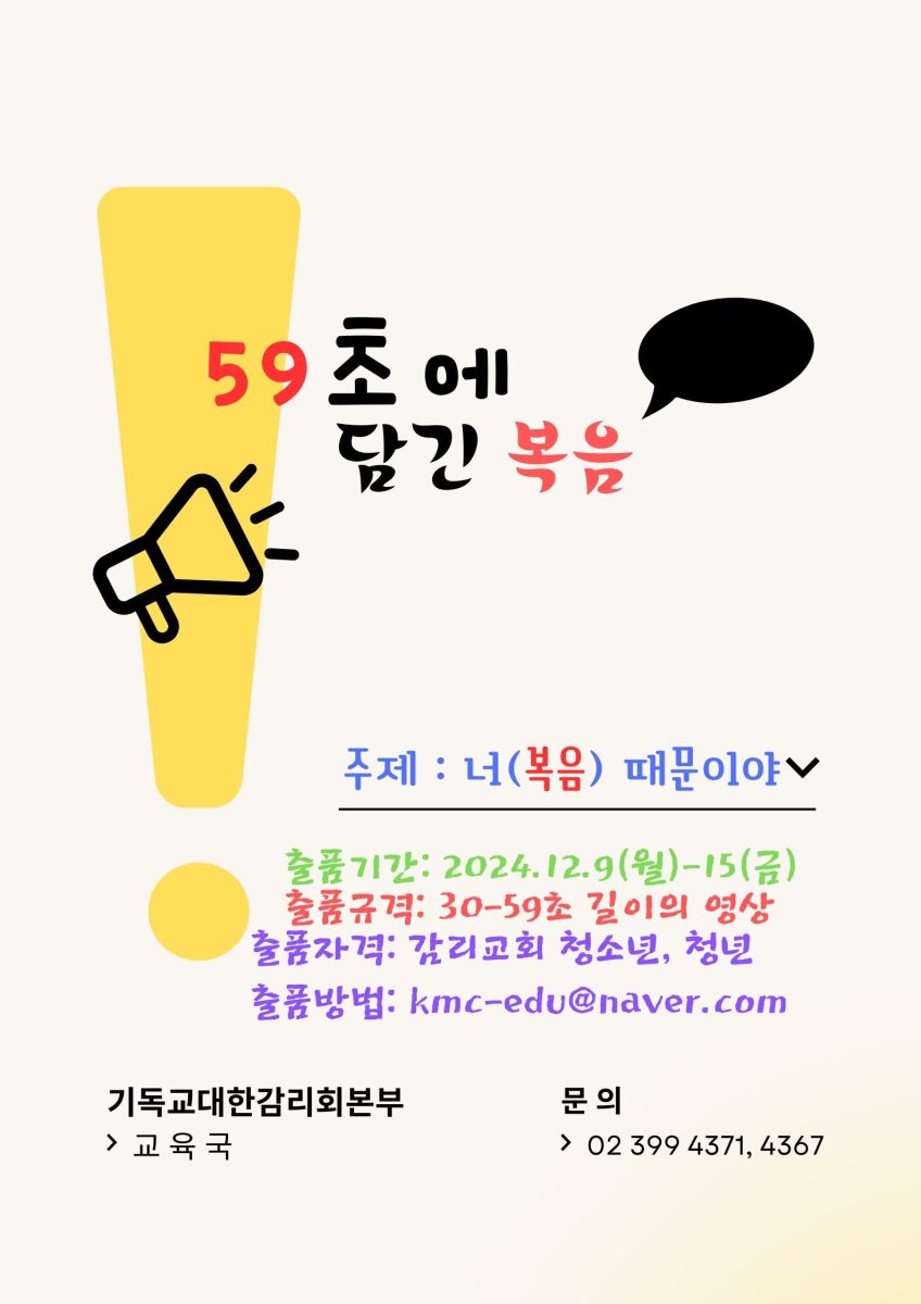 기독교대한감리회본부 교육국에서는 ‘복음’을 주제로 하는 59초 이내의 영상을 공모합니다. 감리교회 청소년/청년(부서별 심사)이라면 누구나 출품할 수 있습니다. 단, 복음의 내용에 맞지 않을 경우 심사에서 제외할 수 있습니다.