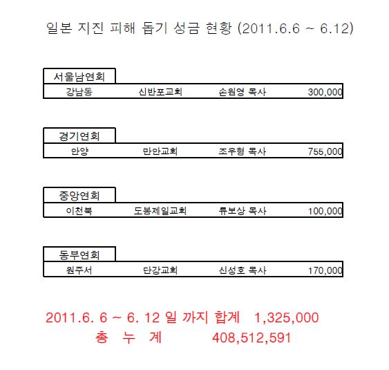 일본 지진 피해 돕기 성금 현황 (2011.6.6-6.12)