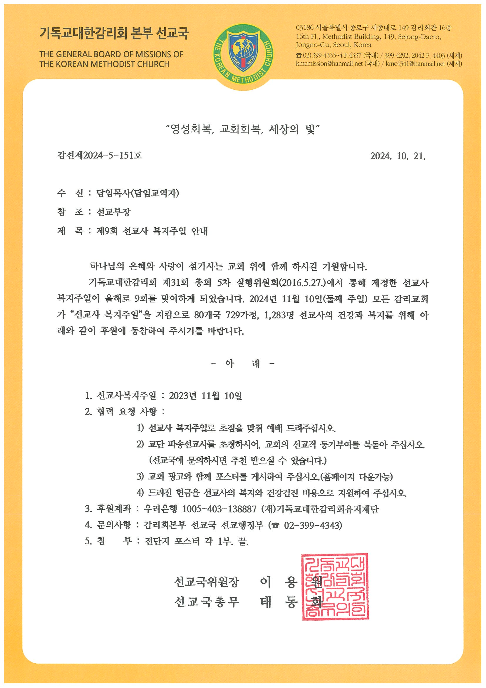4. 문의사항 : 감리회본부 선교국 선교행정부 (☎ 02-399-4343)