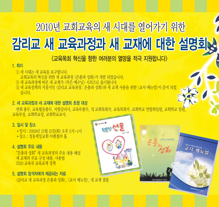 감리회 본부 교육국은 2010년부터 전국 교회학교에서 사용될 새 교회교육과정과 그에 따른 교회학교 교재를 개발하여 아래와 같이 그 설명회를 개최하게 되었습니다.