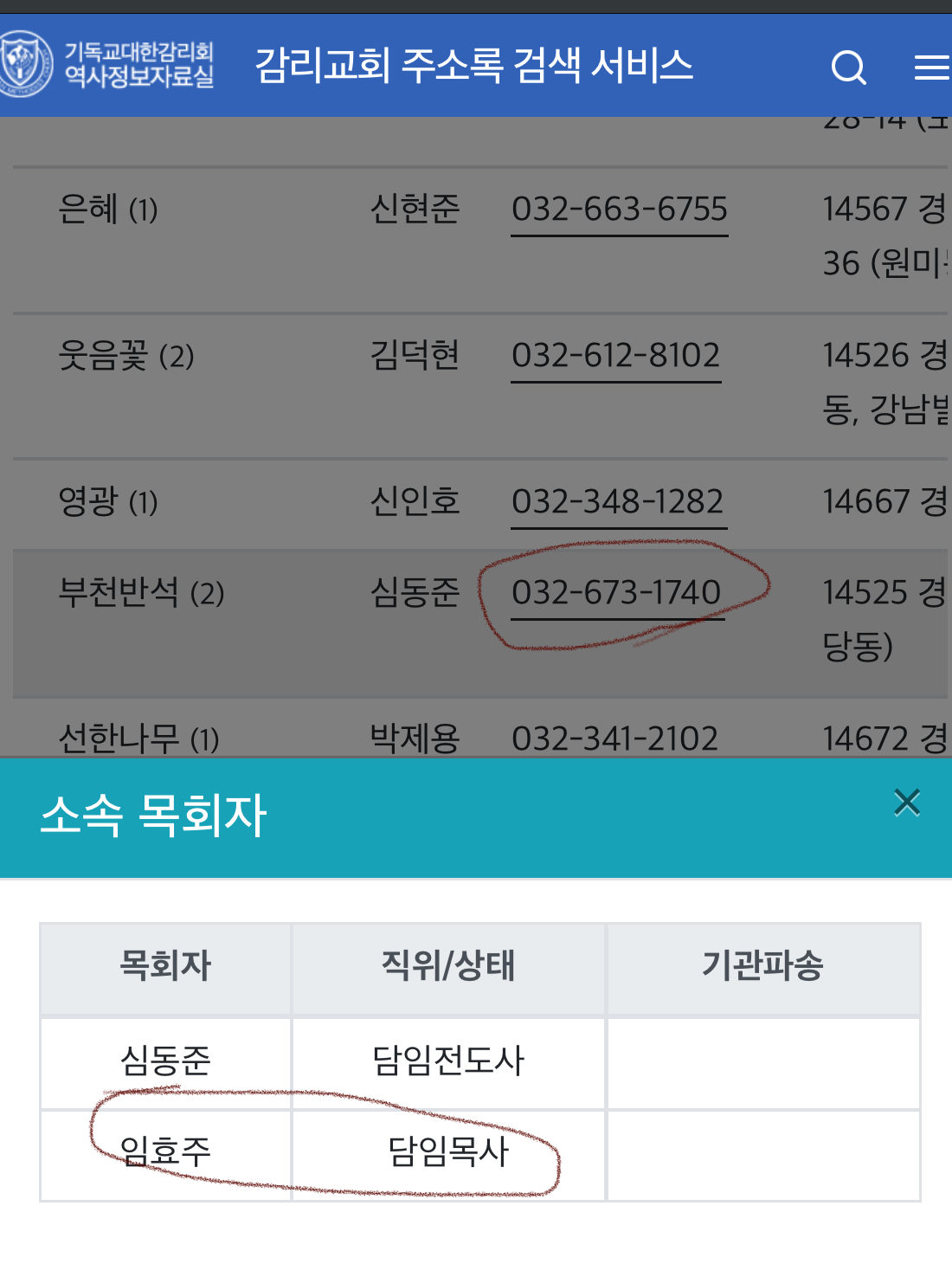 중부연회 부천동지방 부천반석교회 담임자 변경 확인했습니다. 다만 임효주 목사님이 교회 소속으로 계속 나오시는데 현재 저희 교회에 계시지 않습니다. 수정바랍니다. 사진 첨부합니다. 또한 교회 연락처 수정바랍니다. 0507-1374-3480 첨부파일 IMG_2115.jpeg