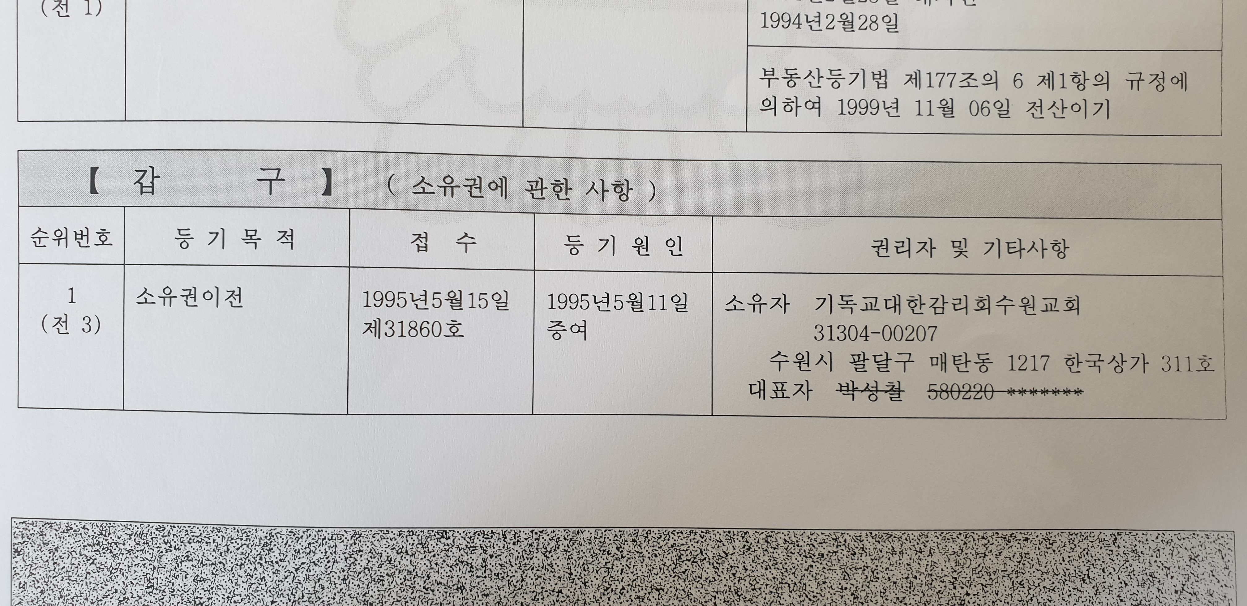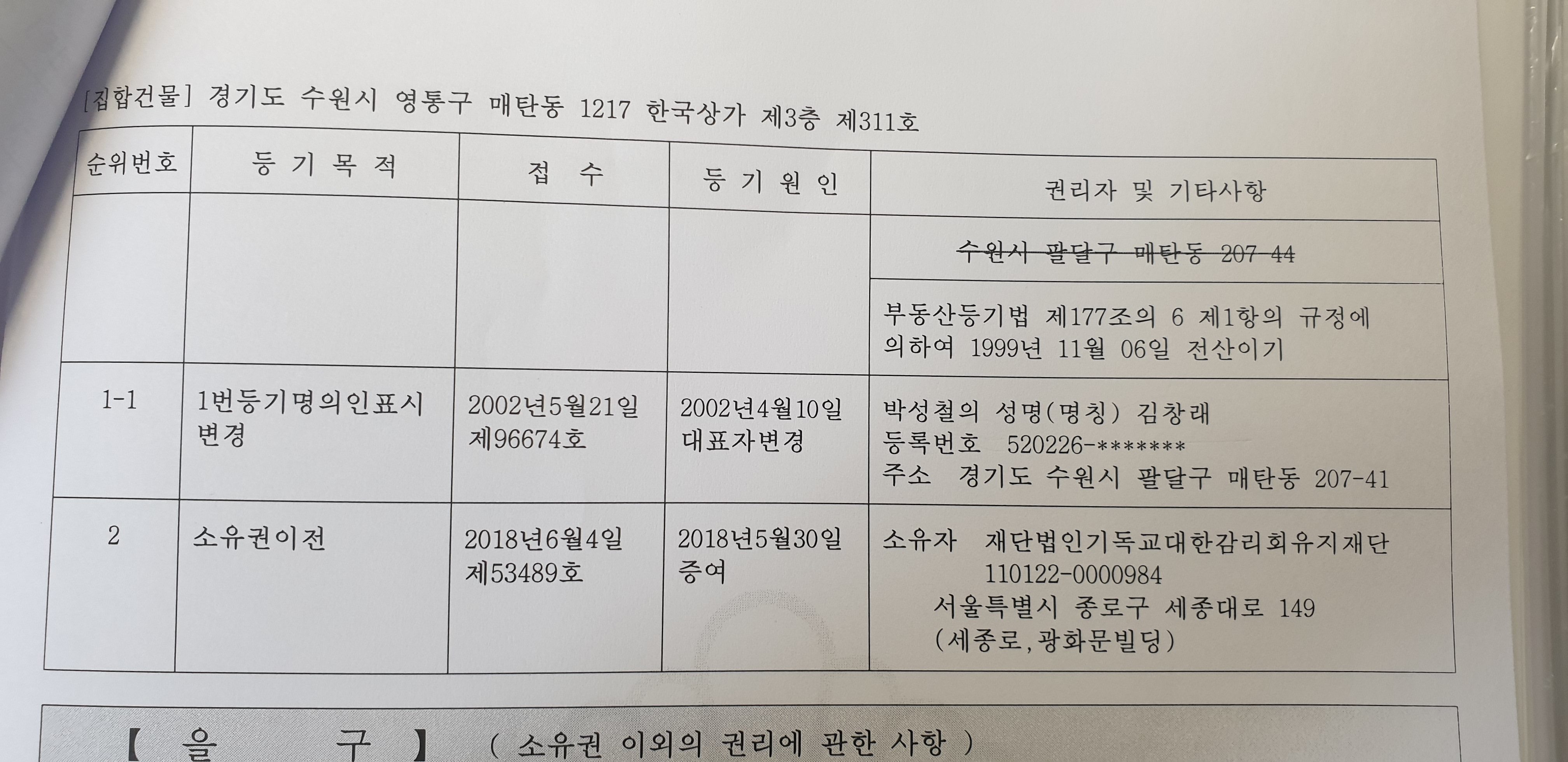 등기부등본상 95년부터 02년까지 박성철 목사께서 수원교회를 목회한 상황입니다.