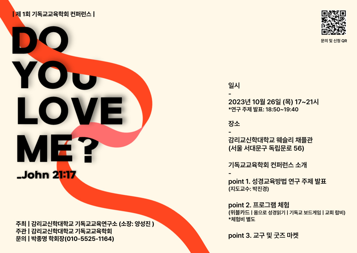 감리교신학대학교 기독교교육연구소(소장 양성진 교수)의 기독교교육학회는 20231026()에 감리교신학대학교 웨슬리 채플에서 “Do You Love Me?(John 21:17)”라는 주제로 제1회 기독교교육 컨퍼런스를 개최한다. 기독교교육 컨퍼런스는 기독교교육연구소(주최)의 기독교교육학회 주관으로 열리며, 현재 양성진 교수와 박진경 교수가 지도교수를 맡고 김영래 교수가 전공교수로 참여한다.