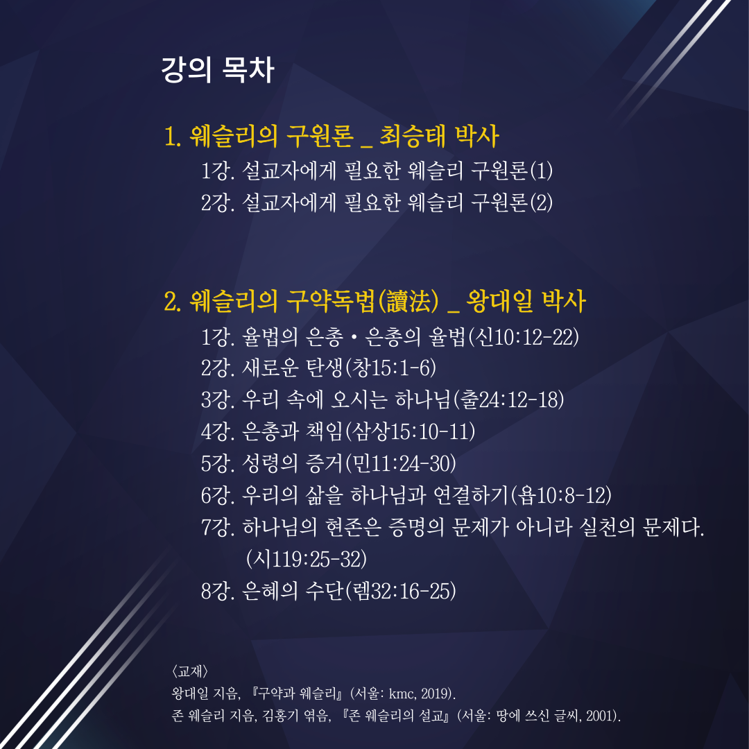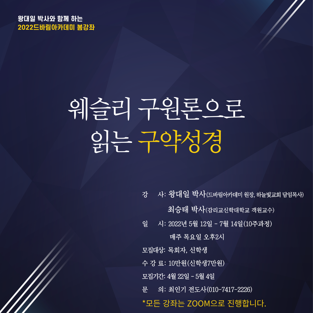 열 마당으로 펼쳐지는 이 강의가 웨슬리의 구원론을 깊이 있게 이해하고, 감리교회의 신앙고백을 강단의 언어로 바꾸어가는 길잡이가 되리라 확신합니다. 이에 2022년도 드바림 아카데미의 봄 강좌로 열리는 “웨슬리 구원론으로 읽은 구약성경”을 감리교회의 미래를 이끌어갈 많은 목회자와 신학생들에게 기쁜 마음으로 적극 추천합니다.