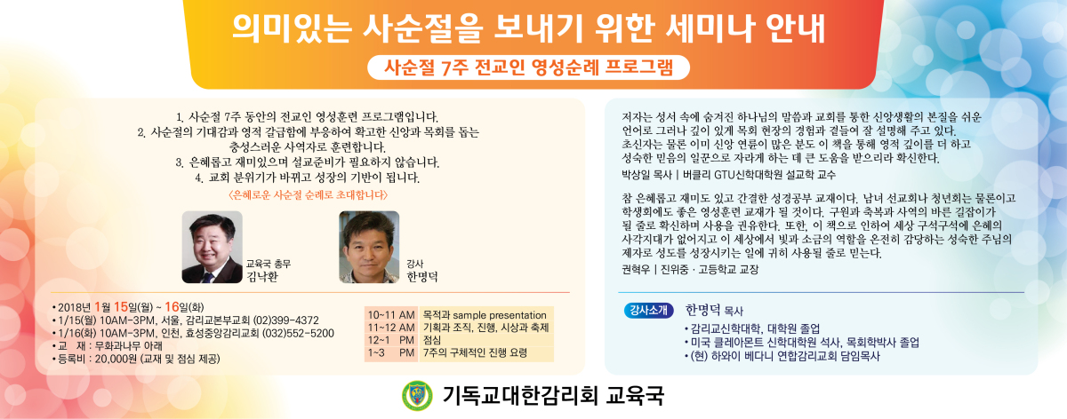 ■ 1차 : 2018년 1월 15일(월) 10AM ~ 3PM [ 서울, 감리회본부교회 (02)399-4372 ]