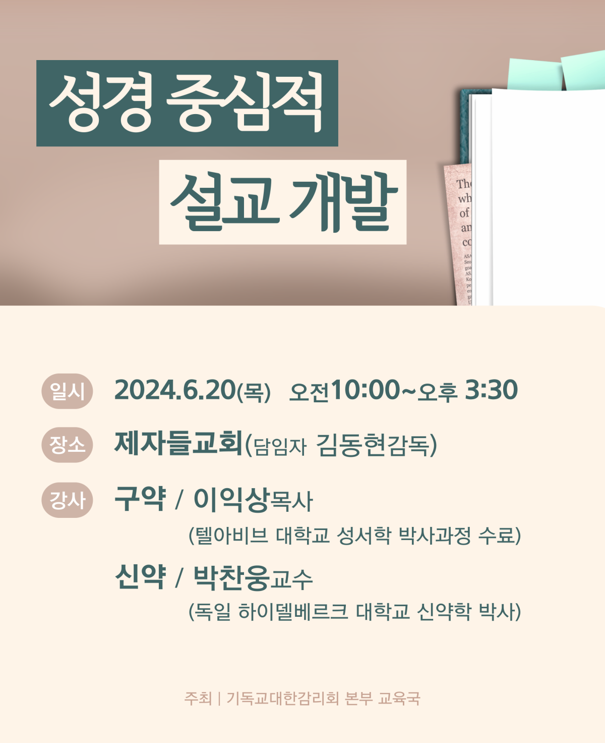 기독교대한감리회 본부 교육국(총무:김두범 목사)은 풍성하고 깊이 있는 설교를 위한 “성경 중심적 설교 개발” 세미나를 준비하였습니다. 이번 세미나는 성경 중심적인 해석 방법을 통하여 실제 설교 준비 과정에 도움이 될 것입니다. 설교 준비를 고민하는 목회자들의 적극적인 참여를 바랍니다.