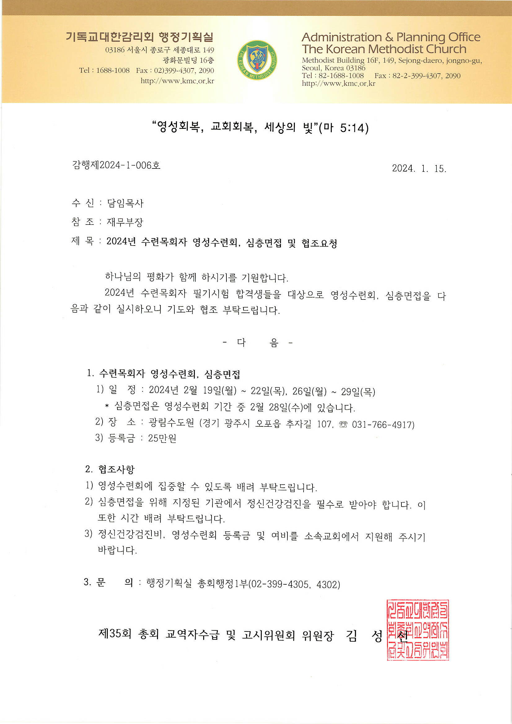 5. 문의 : 감리회본부 행정기획실 총회행정1부 (☎ 02-399-4305, 4302)