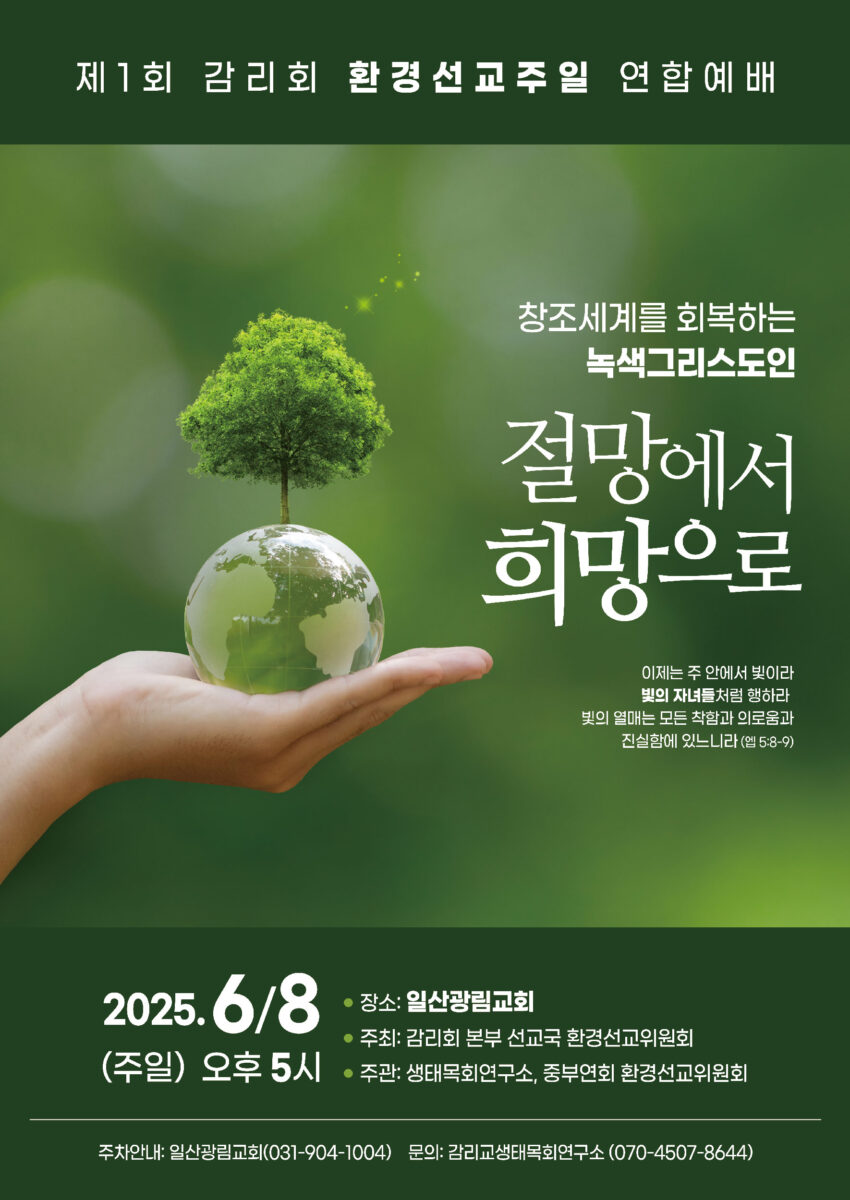 이에 제42회 환경선교주일을 맞이하여 환경선교가 우리 시대의 핵심적인 선교 과제임을 고백하는 교회들이 함께 모여 제1회 감리회 환경선교주일연합예배를 통해 감리교회에 환경선교의 새로운 장을 열어나가고자 합니다.