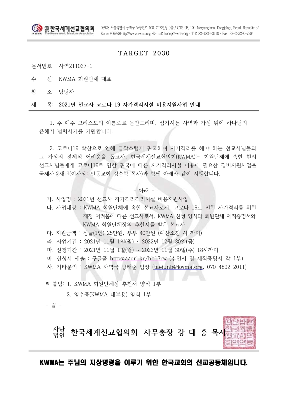 [KWMA] 2021년 선교사 코로나19 자가격리시설 비용지원사업 안내의 건