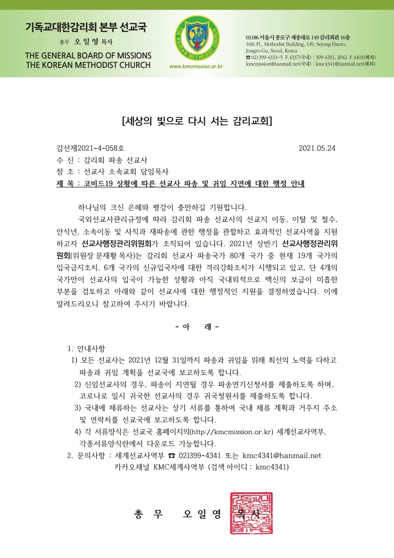코비드19 상황에 따른 선교사 파송 및 귀임 지연에 대한 행정 안내