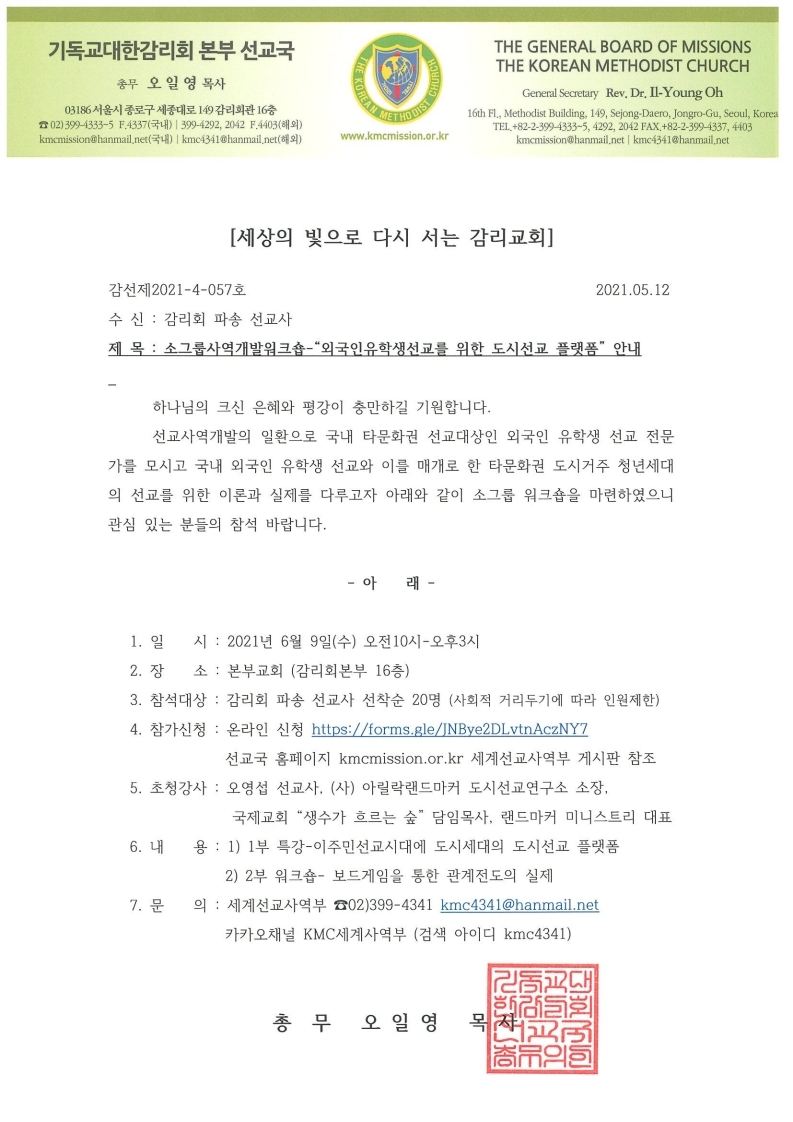 소그룹사역 개발워크숍 <외국인 유학생 선교를 위한 도시선교 플랫폼> 안내