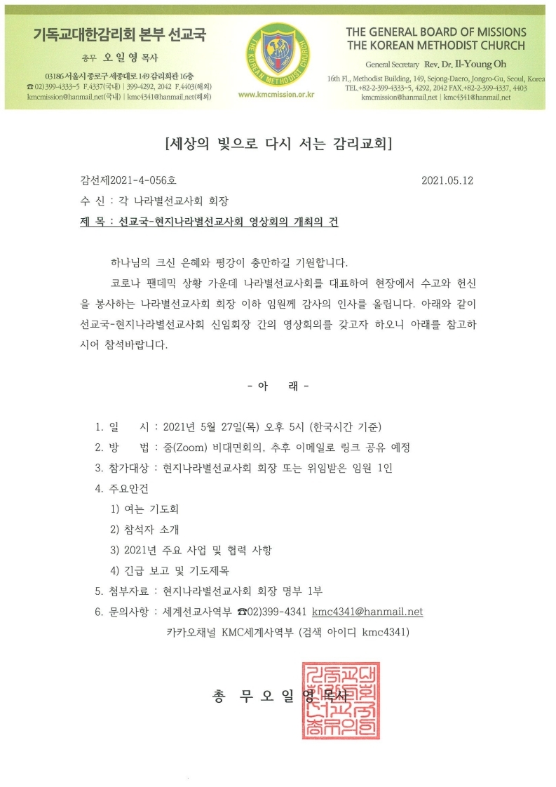 선교국-현지나라별선교사회 영상회의 개최의 건
