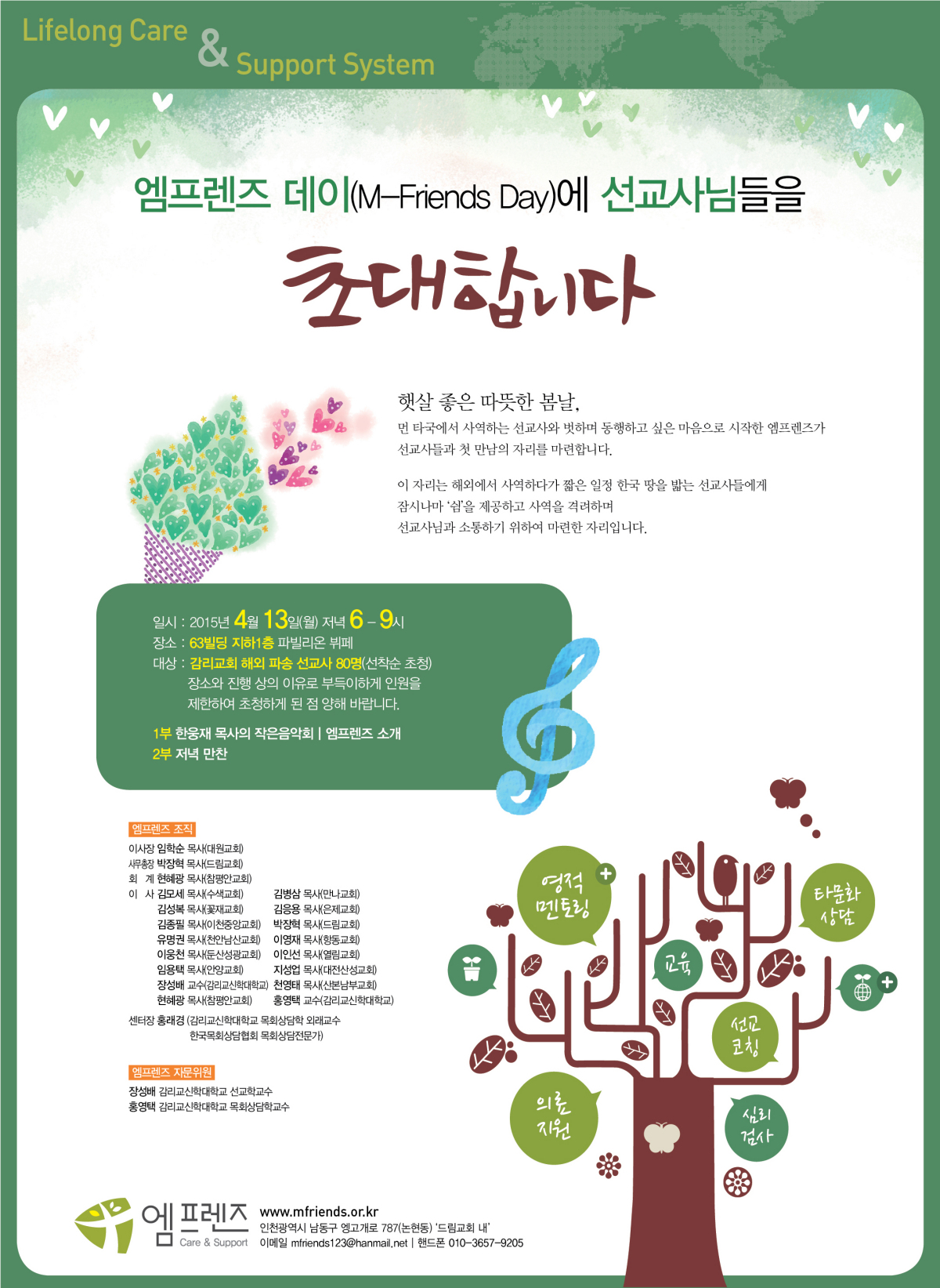 선교사와 동행하는 친구와 같은 사람들 엠프렌즈(M-Friends) 쎈터장 홍래경 010-3657-9205 *화면을 클릭하시면 확대해서 보실수 있습니다. 첨부파일 광고_엠프렌즈.jpg