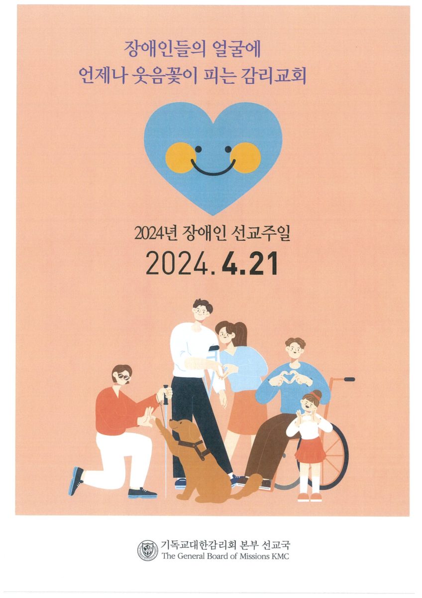 감리회 본부 선교국에서는 장애인 선교주일을 맞아 장애인 선교주일 자료집을 준비했습니다. 올해 장애인 선교주일 자료집은 <장애인들의 얼굴에 언제나 웃음꽃이 피는 감리교회>라는 주제로, 장애인과 비장애인이 한 자리에서 구분 없이 예배하고, 신앙생활하는 교회를 꿈꾸며, 장애인과 함께 하는 교회의 이야기를 담았습니다. 감리교회가 장애인들이 비장애인들과 함께 신앙생활 하면서 언제나 환하게 웃을 수 있는 든든한 곁이 되어 주었으면 좋겠다는 기도와 바람으로 준비했습니다.