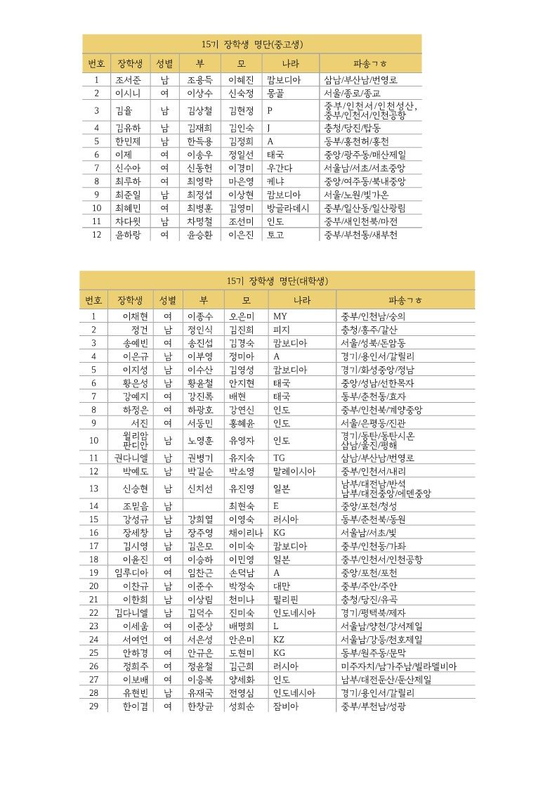 선교사자녀장학재단 2024년 15기 장학생 명단(중고생 12명/대학생 29명/총 41명)