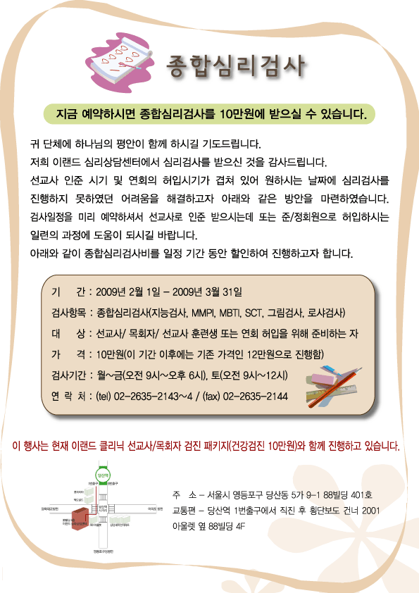 이랜드클리닉에서 선교사인준심사에 필요한 종합심리검사에 대한 할인행사를 아래와 같이 진행합니다. 첨부자료를 참조하셔서 선교사인준지원예정자들에게 조금이나마 도움이 되길 바랍니다. 첨부파일 종합심리검사_할인3.gif