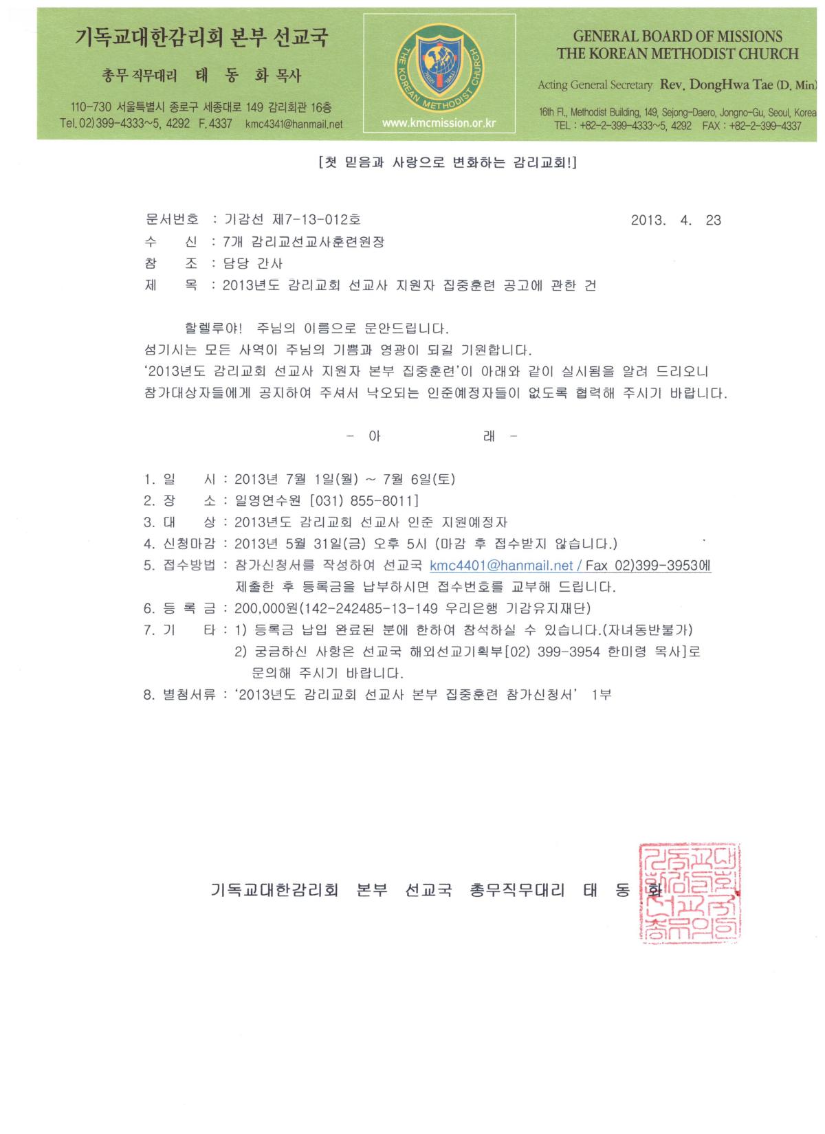 2013년도 감리교회 선교사지원자 집중훈련 공고(2013)