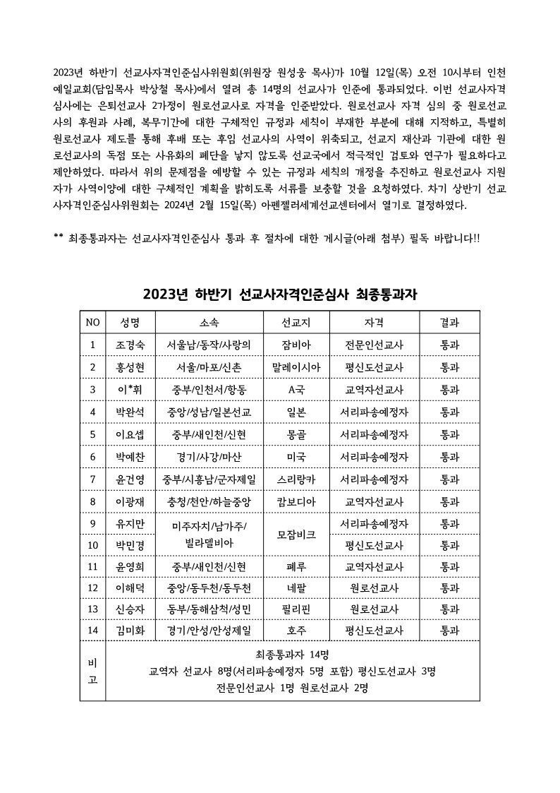 2023년 하반기 선교사자격인준심사 최종통과자 안내의 건