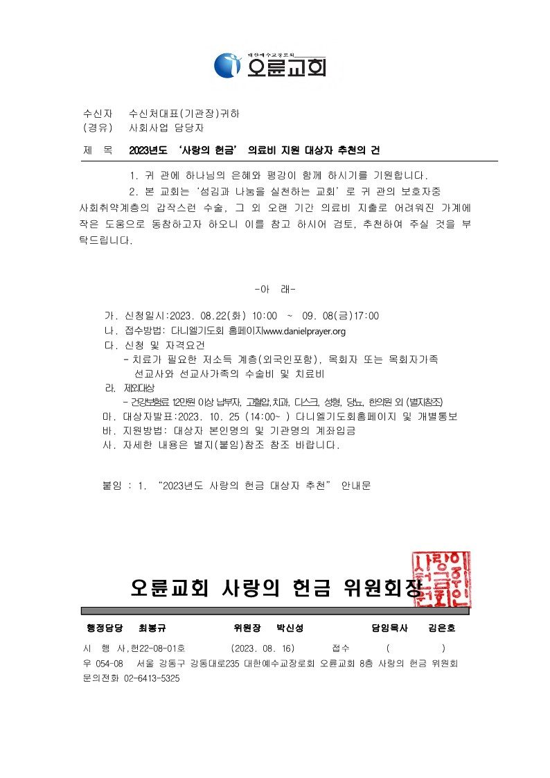 [세계선교사역부] 2023년도 오륜교회 ‘사랑의 헌금’ 의료비 및 선교사 자녀 장학금 지원 신청 안내의 건