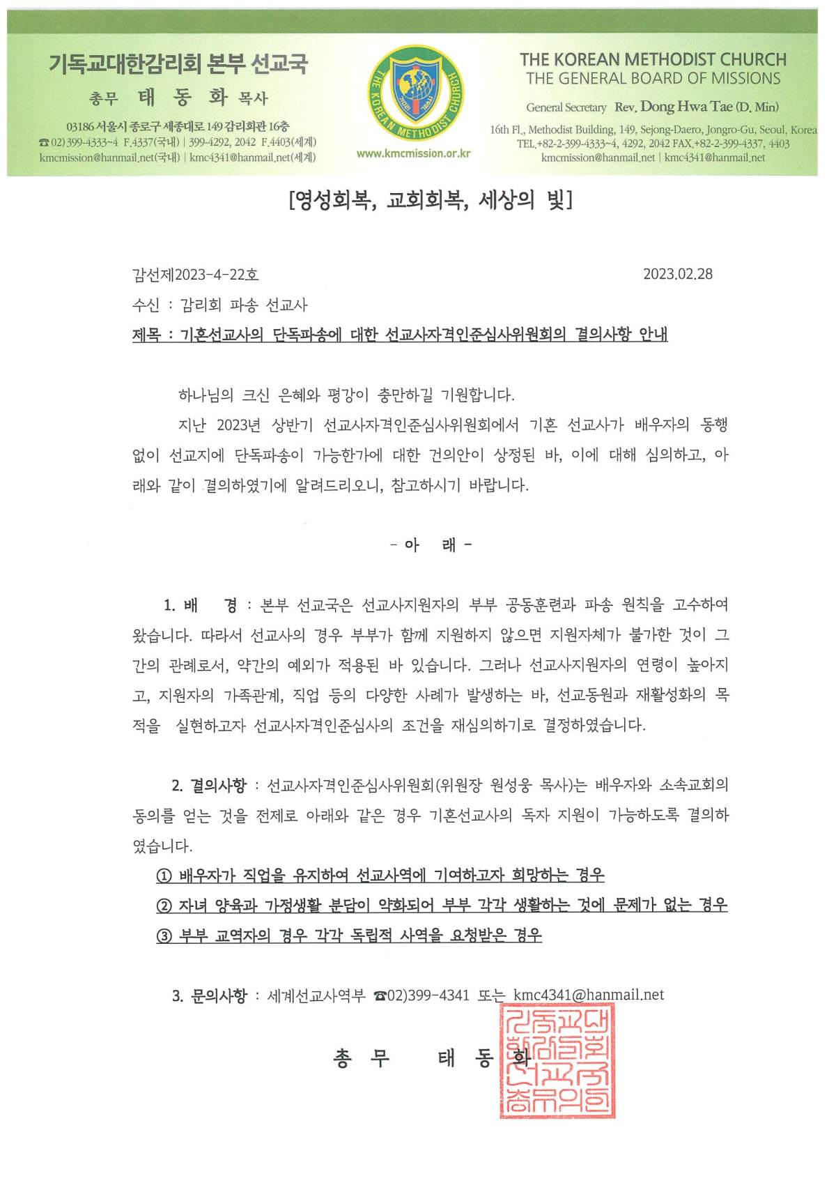 기혼선교사의 단독파송에 대한 선교사자격인준심사위원회 결의사항 안내의 건