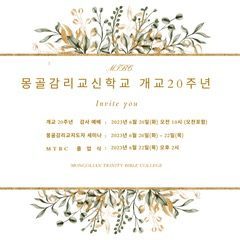 몽골감리교신학교(Mongolian Trinity Bible College)가 개교 20주년을 맞게 되었습니다. 지난 20년 동안 신학교 사역의 주체가 되신 하나님께 무한한 영광을 드립니다. 개교 20주년을 맞아 20년 동안 몽골감리교신학교를 후원해 주신 목사님들과 선교 담당자들을 모시고 20주년 기념 예배를 드리고자 합니다.