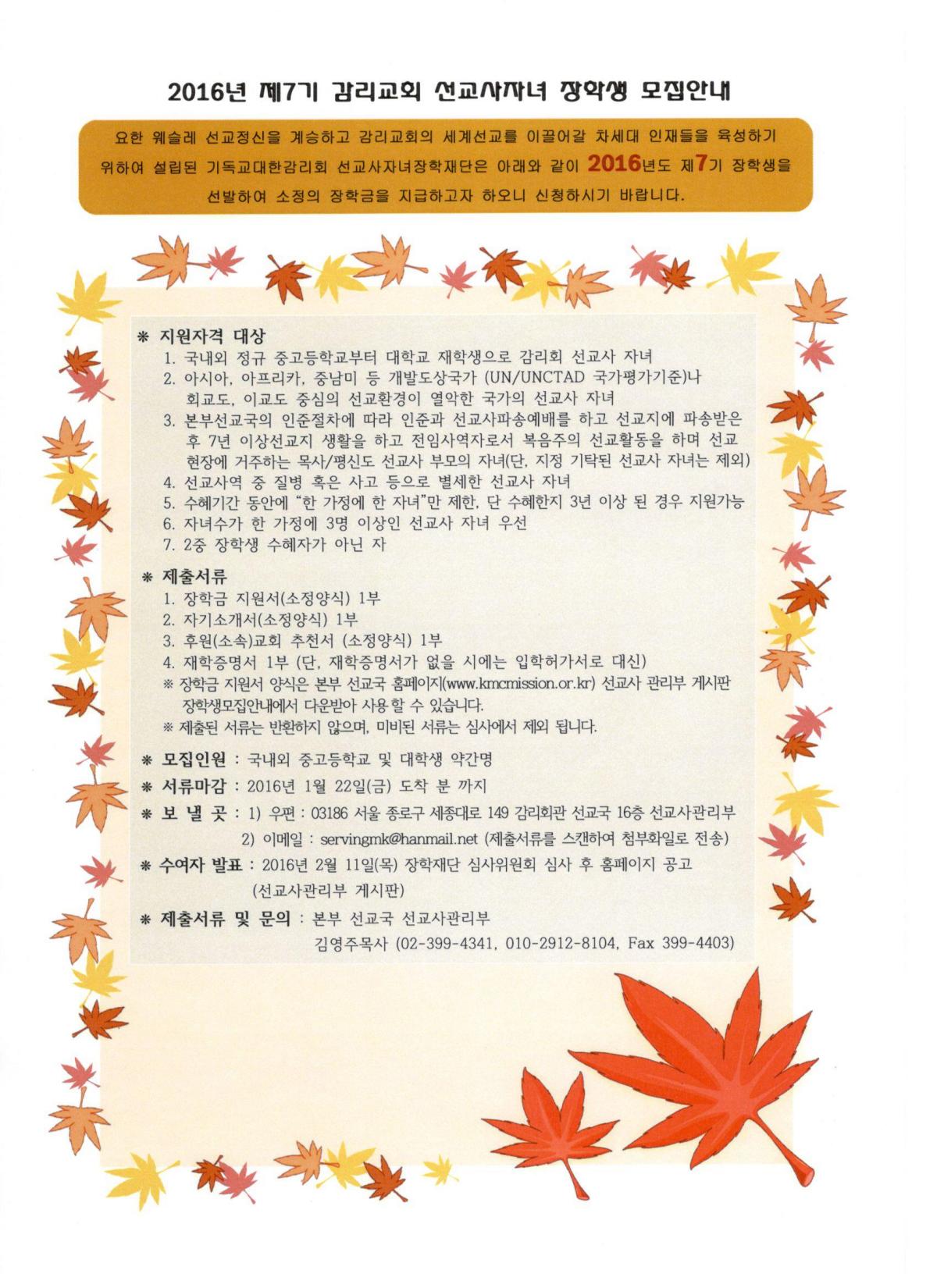 제 목 : 2016년 제7기 선교사자녀 장학생모집 공고에 관한 건