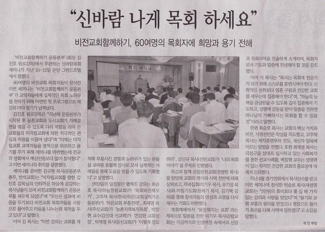 지난 2010년 5월 10-12일 온양 그랜드호텔에서 58명의 미자립교회목회자가 참여한 가운데 신바람목회세미나가 열렸습니다.